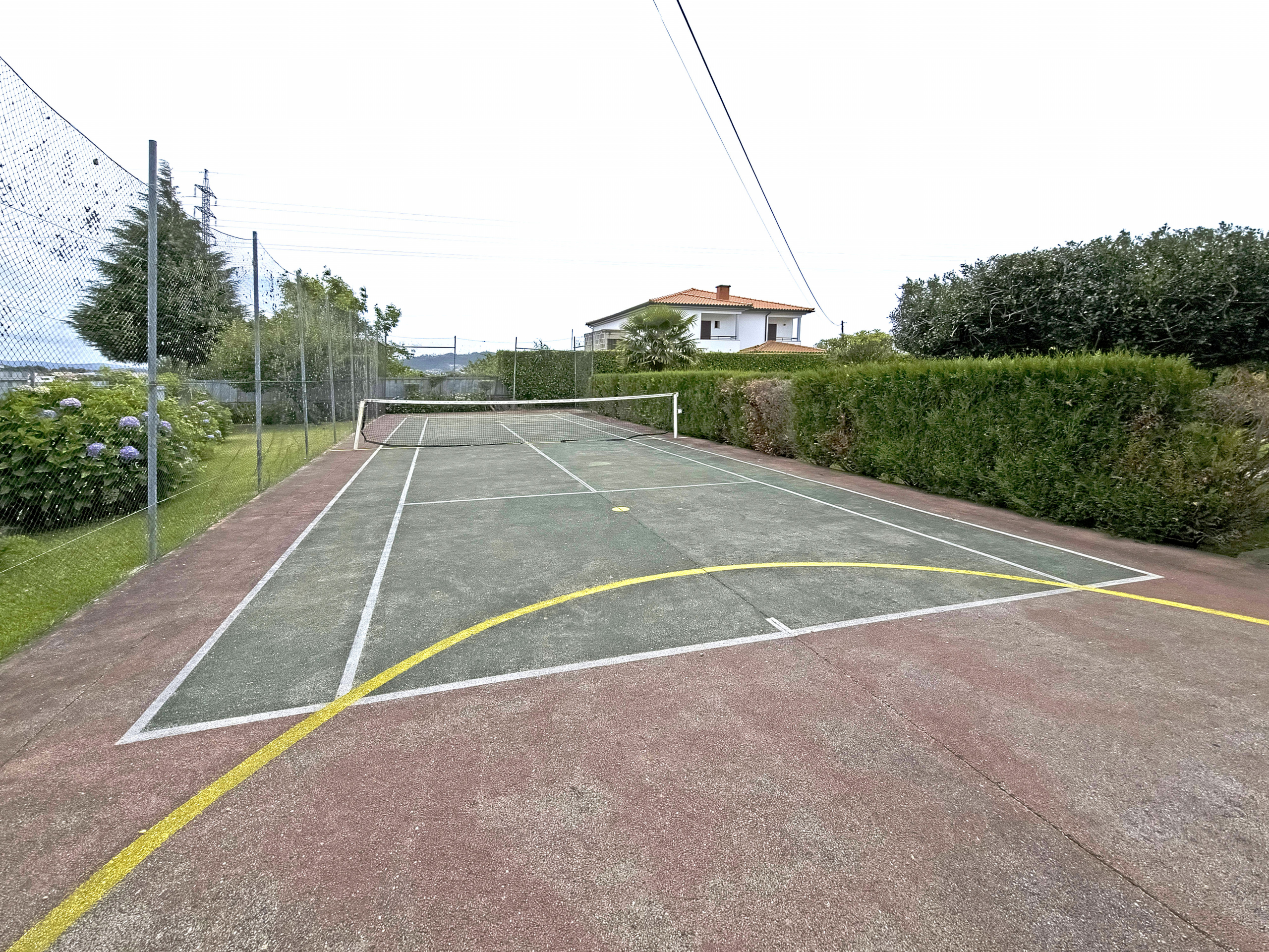 Manicured hedges and stone pathways frame a private tennis practice court, offering both recreation and quiet reflection. Furthermore, three outdoor parking spaces ensure practicality and convenience.