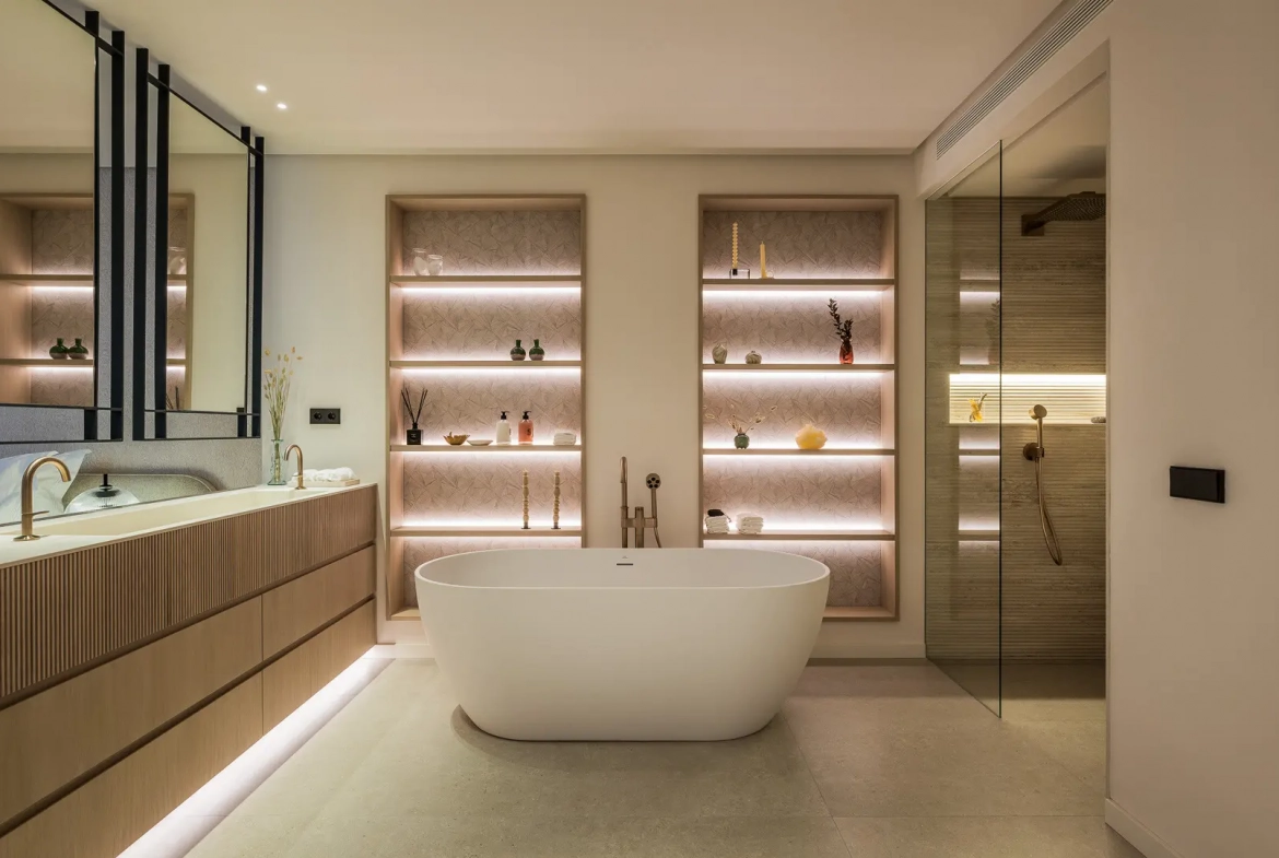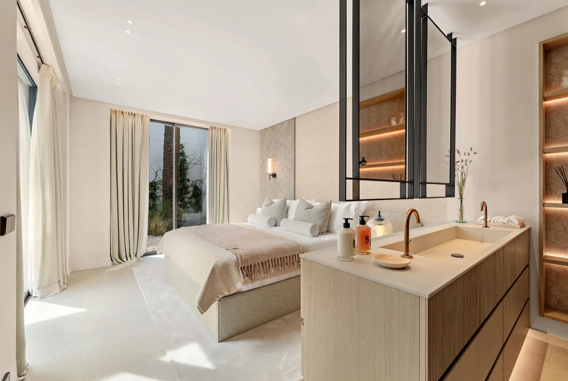 This level accommodates four elegant en-suite bedrooms. Furthermore, each bedroom enjoys its own private terrace, ensuring privacy and outdoor access. The master suite, spanning nearly 40 m², offers a refined retreat. Notably, it features an open-concept walk-in wardrobe and a designer bathroom, creating a calm and intimate atmosphere.