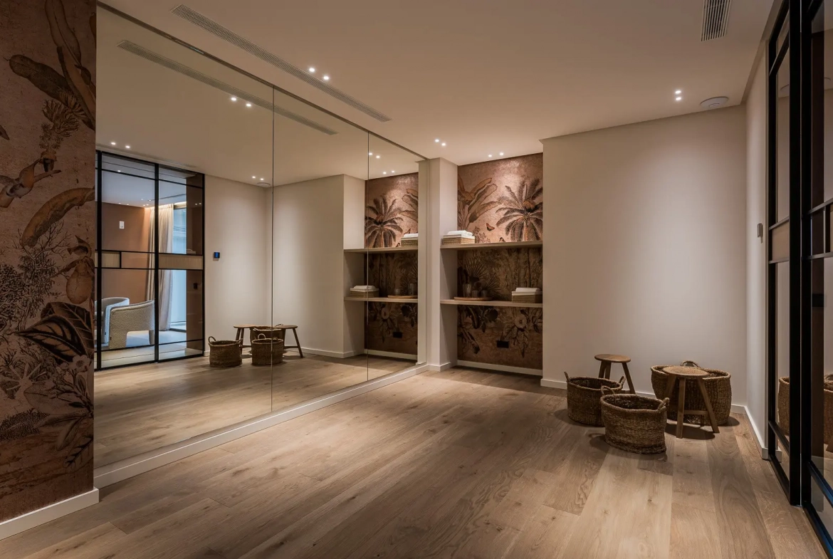 Descending to the basement level, the villa reveals a range of practical and lifestyle-focused amenities. For example, this level includes a fully equipped gym, a private office, and a dedicated laundry area. Therefore, the home balances leisure, work, and everyday convenience.