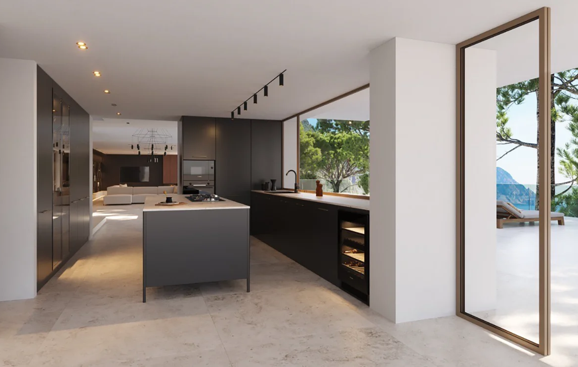 The kitchen also includes a dining area and features large glass walls that highlight the sea views and bring warmth to the interior design.