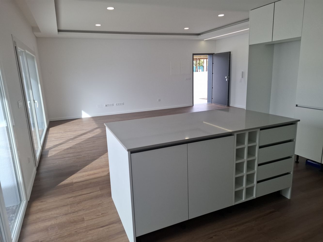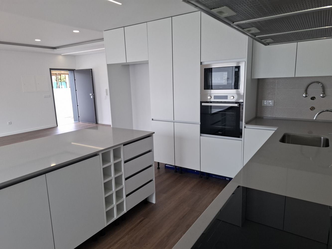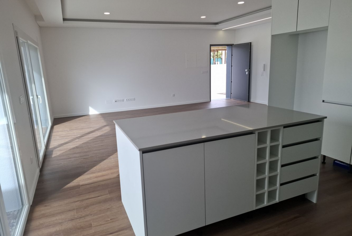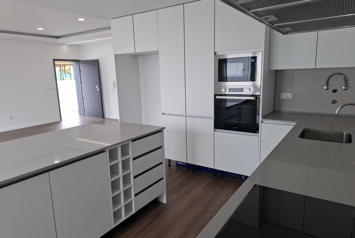 The modern kitchen is fully equipped with Teka appliances, thermolaminated cabinetry, and a stylish Silestone countertop, combining elegance with practicality.