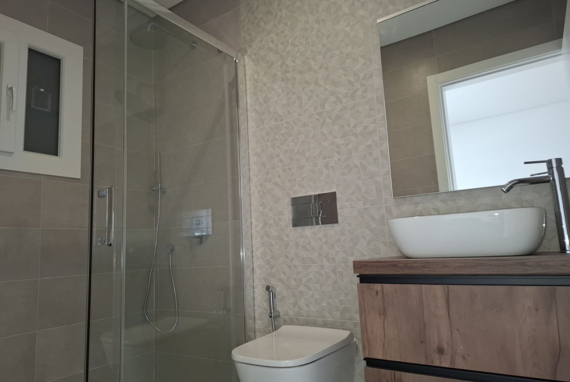 The bathrooms feature suspended sanitary fixtures, modern furniture, and elegant shower bases, adding a contemporary touch to the home.
