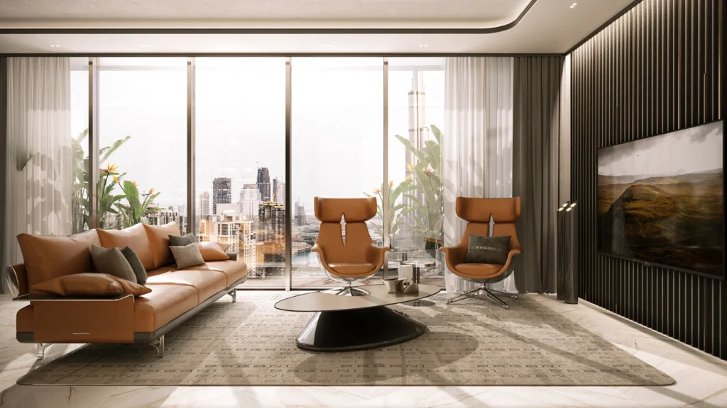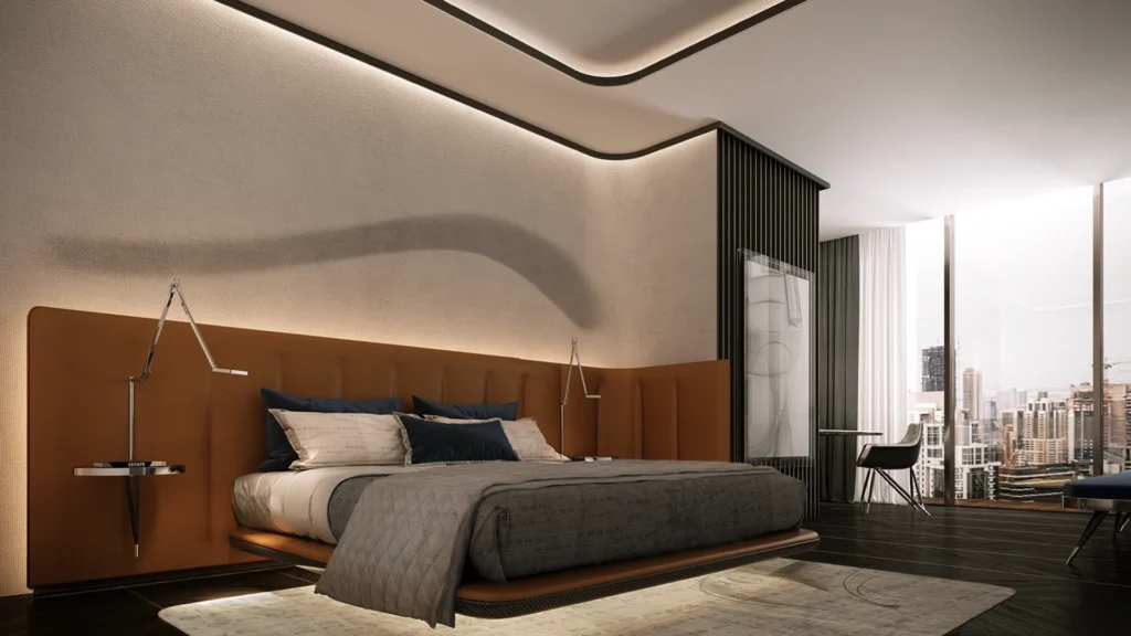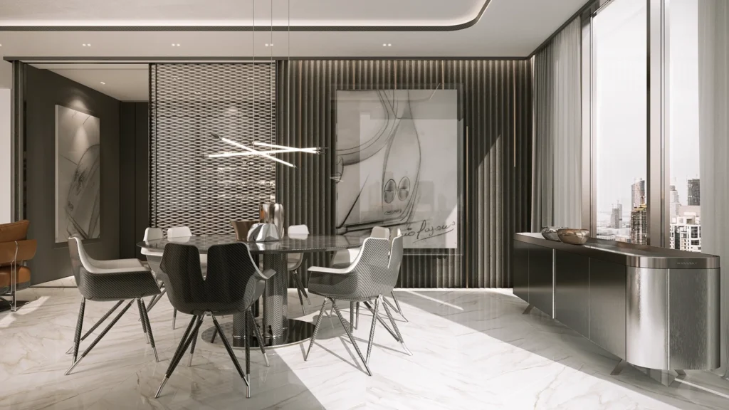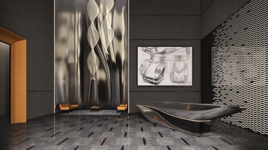 DaVinci Tower stands as the world’s first residential building with interiors designed by Pagani. Therefore, each residence reflects a distinctive design philosophy inspired by precision and craftsmanship. Refined marble finishes, sculptural details, and harmonious lines define the living spaces. In addition, expansive glazing invites natural light while showcasing panoramic canal and skyline views.