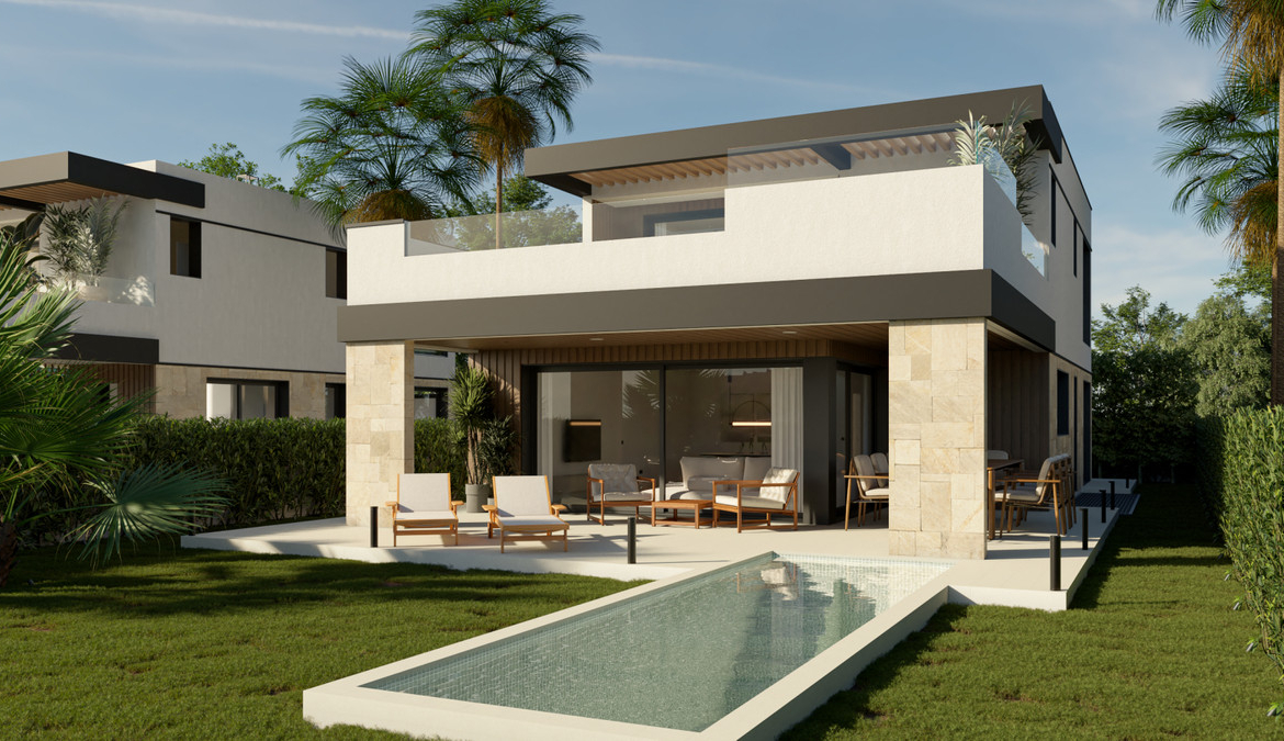 Outdoor spaces are designed to create a peaceful retreat where residents can fully enjoy the Mediterranean climate. Each villa features a private swimming pool and beautifully landscaped garden overlooking the golf course, providing a serene environment for relaxation and outdoor living.