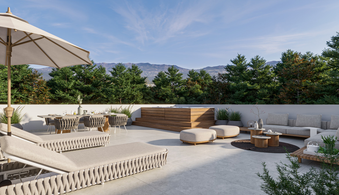 The southwest-facing solarium offers a spacious and elegant outdoor area with beautiful views over the garden and swimming pool. It includes a comfortable chill-out zone and an outdoor dining space, making it the perfect setting for enjoying the afternoon sun and spectacular Mediterranean sunsets.