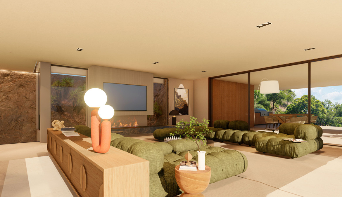 The villa is thoughtfully designed across two levels, featuring clean architectural lines and spacious open interiors that blend beautifully with the surrounding environment. Expansive floor-to-ceiling windows allow natural light to fill the home while perfectly framing the spectacular views of the ocean and mountainous scenery. This design approach creates a seamless connection between the indoor living spaces and the natural beauty outside.