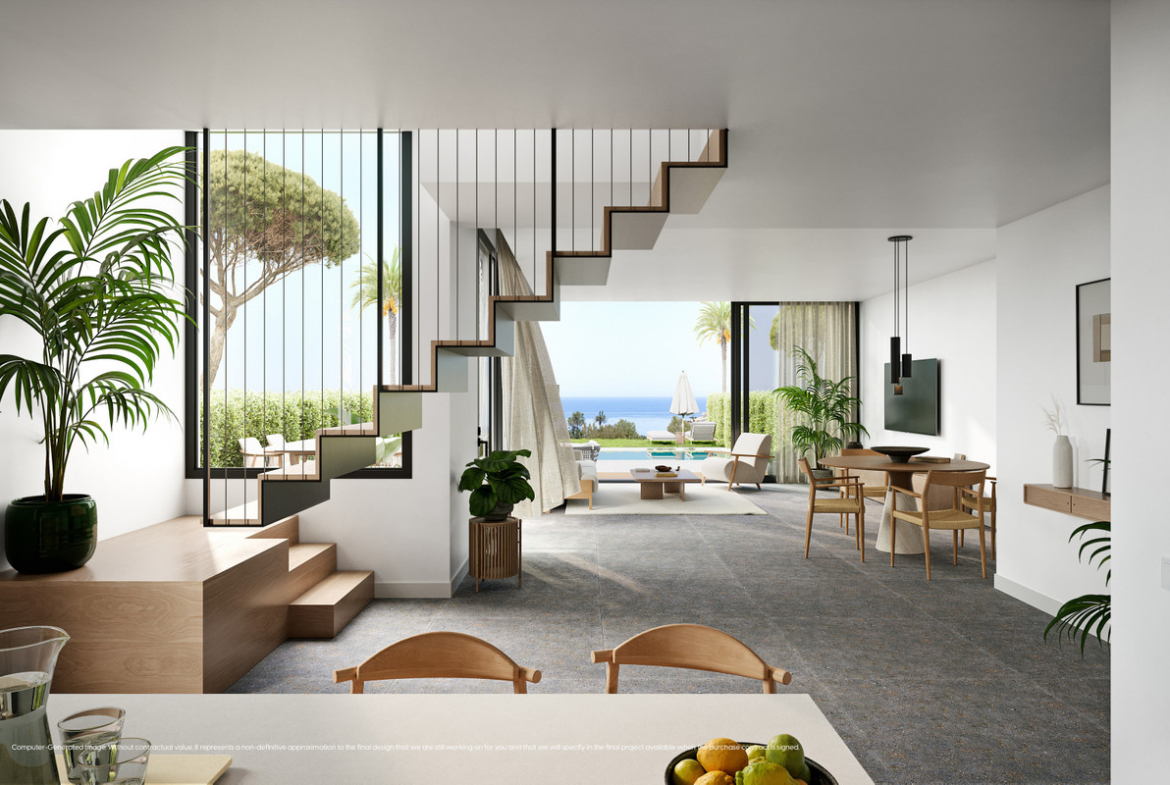 Inside the villas, thoughtful design elements enhance the overall aesthetic experience. A striking staircase, conceived as a sculptural centerpiece, elevates the living area and creates a space that resembles a private art gallery.