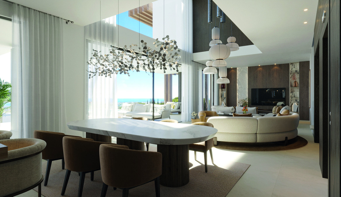 Each villa features a spectacular open-plan layout centred around a main living area with a dramatic six-metre-high ceiling. This architectural element creates a bright and airy atmosphere while framing breathtaking panoramic views of the sea and surrounding mountains.