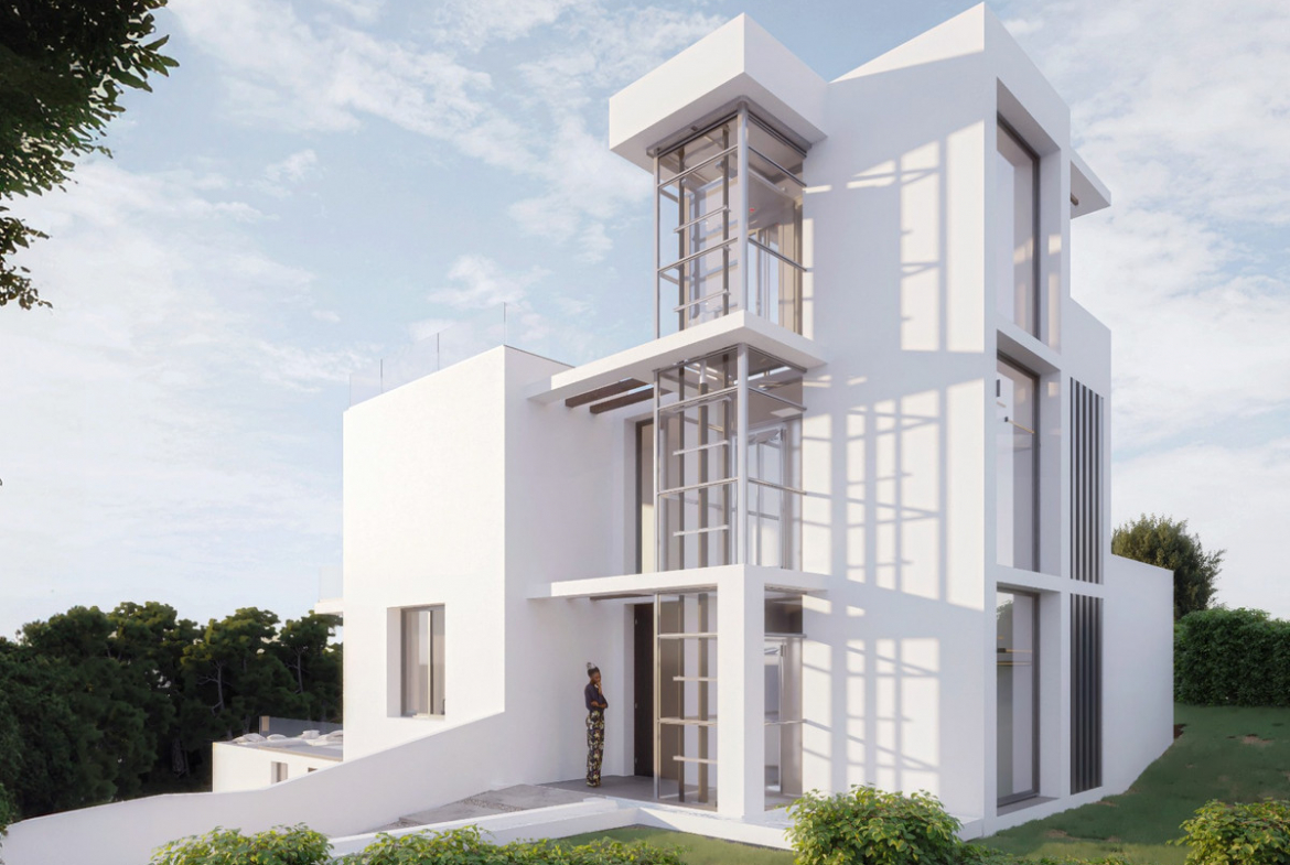 The underground basement offers secure parking space for two vehicles, along with an additional carport for two more cars and convenient street parking nearby. A panoramic elevator connects the basement level directly to the rooftop solarium, providing easy access throughout the property.