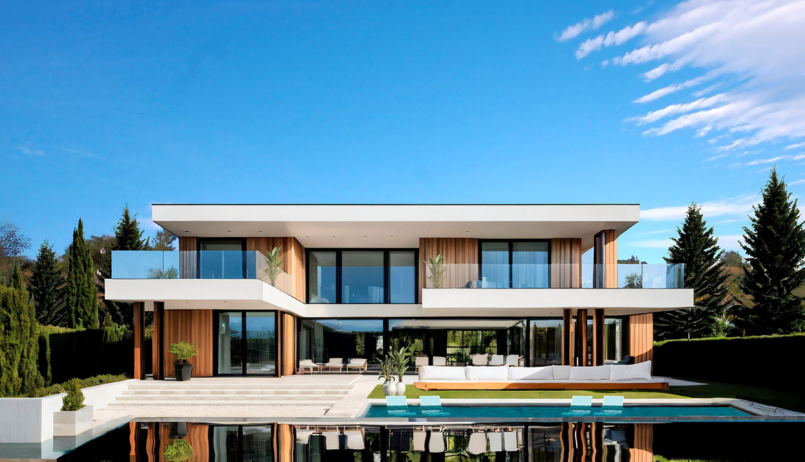 The villa is built on a generous 1,263 m² plot and features a contemporary two-level design with a total built area of 267 m² and a usable interior space of 225.44 m². The south-facing orientation ensures abundant natural light throughout the day and allows residents to enjoy spectacular views of the surrounding golf course and landscape.