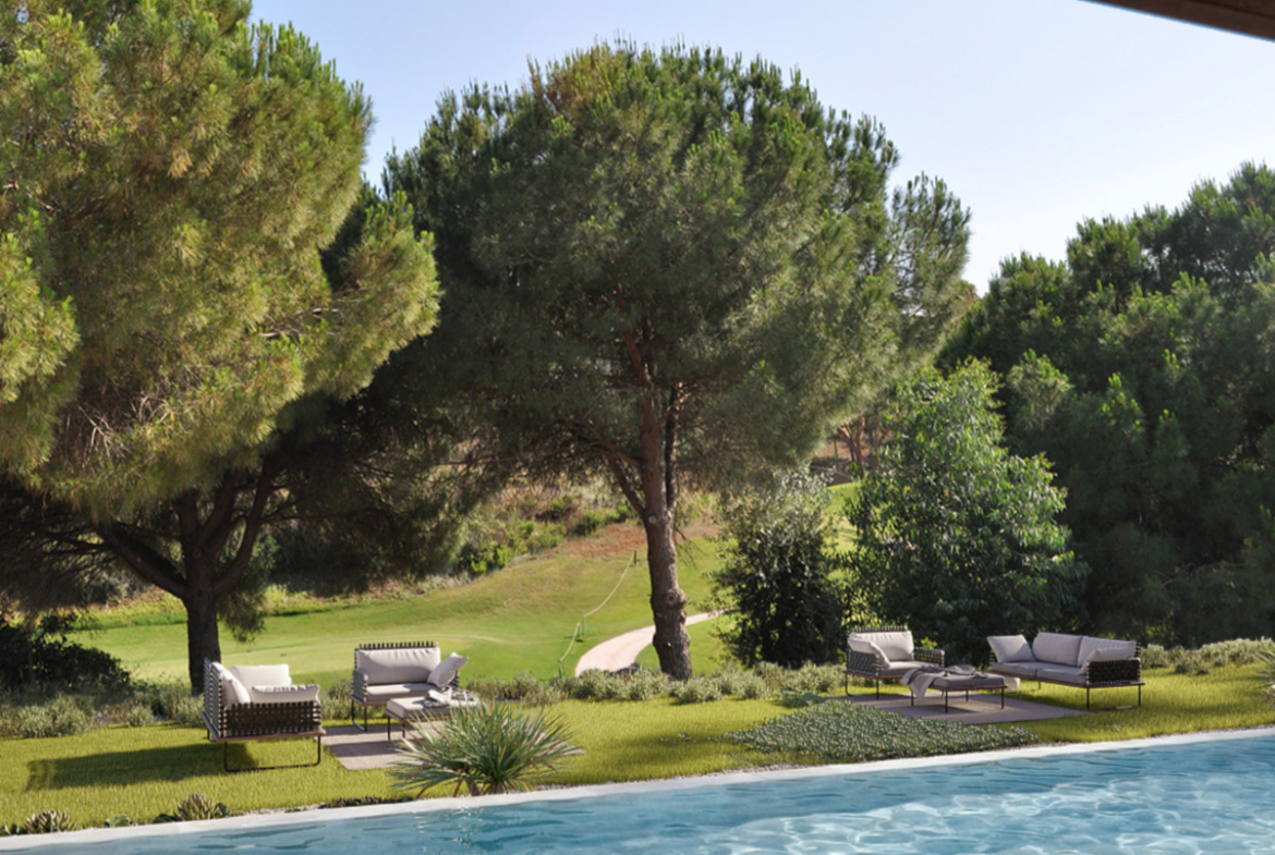 The infinity-edge swimming pool overlooks the golf course, providing spectacular views and a perfect environment to enjoy the Mediterranean climate throughout the year.