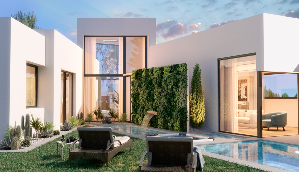 Sunbeds are positioned for enjoying the Spanish sunshine, while the elegant swimming pool, finished with Indonesian stone, enhances the beauty of the outdoor space while naturally helping to purify the water.