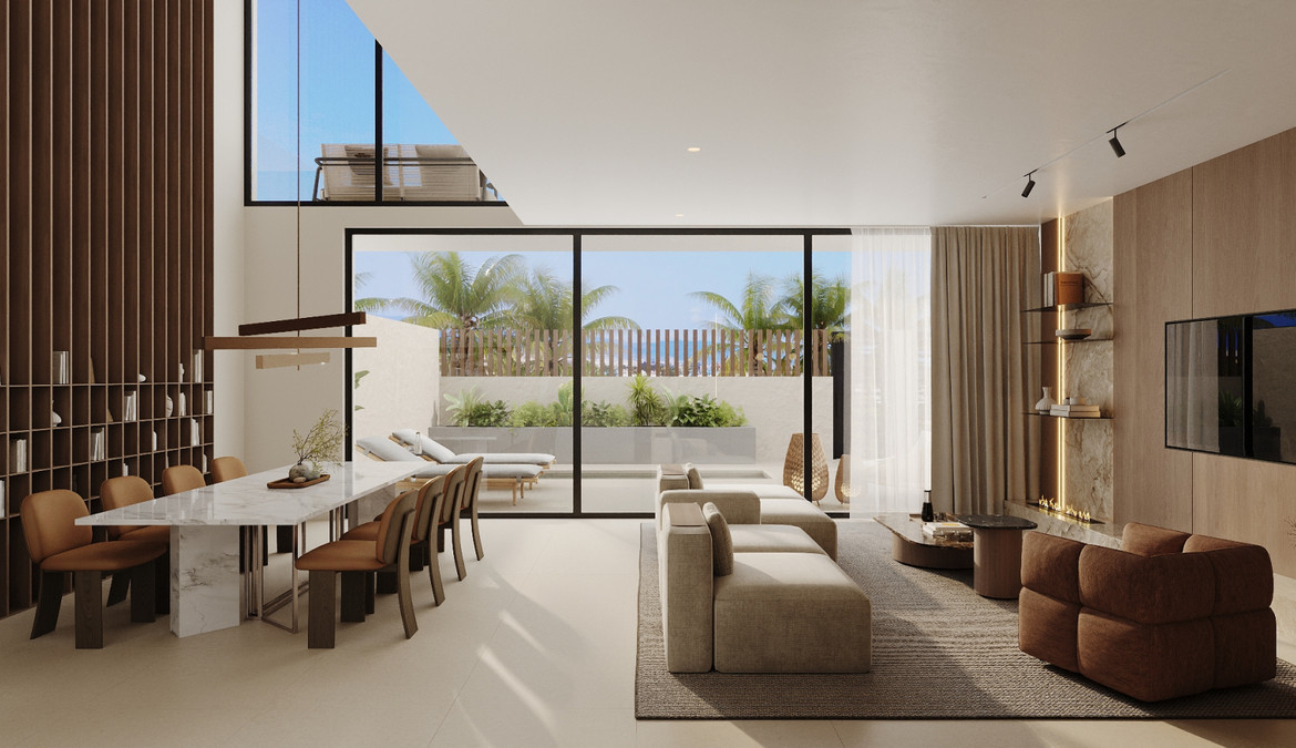 The architecture features clean, modern lines that integrate harmoniously with the surrounding urban and coastal landscape. Large windows and open façades allow natural light to flow throughout the homes, creating bright and inviting interiors.