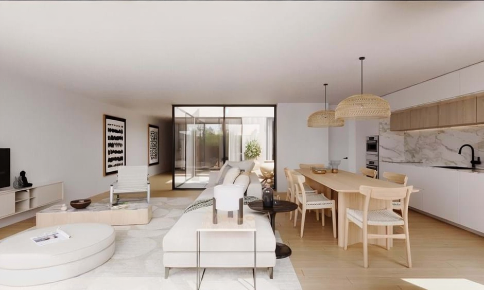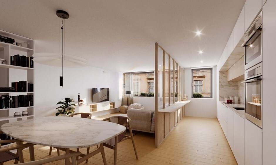 The apartment features a spacious open-plan living room connected to a fully equipped kitchen with Bosch appliances. Therefore, it creates a bright and functional living environment.