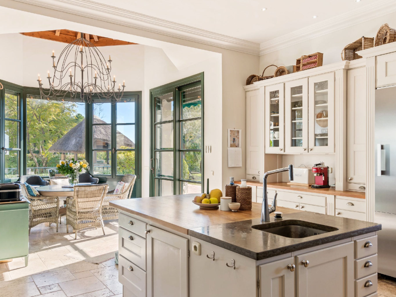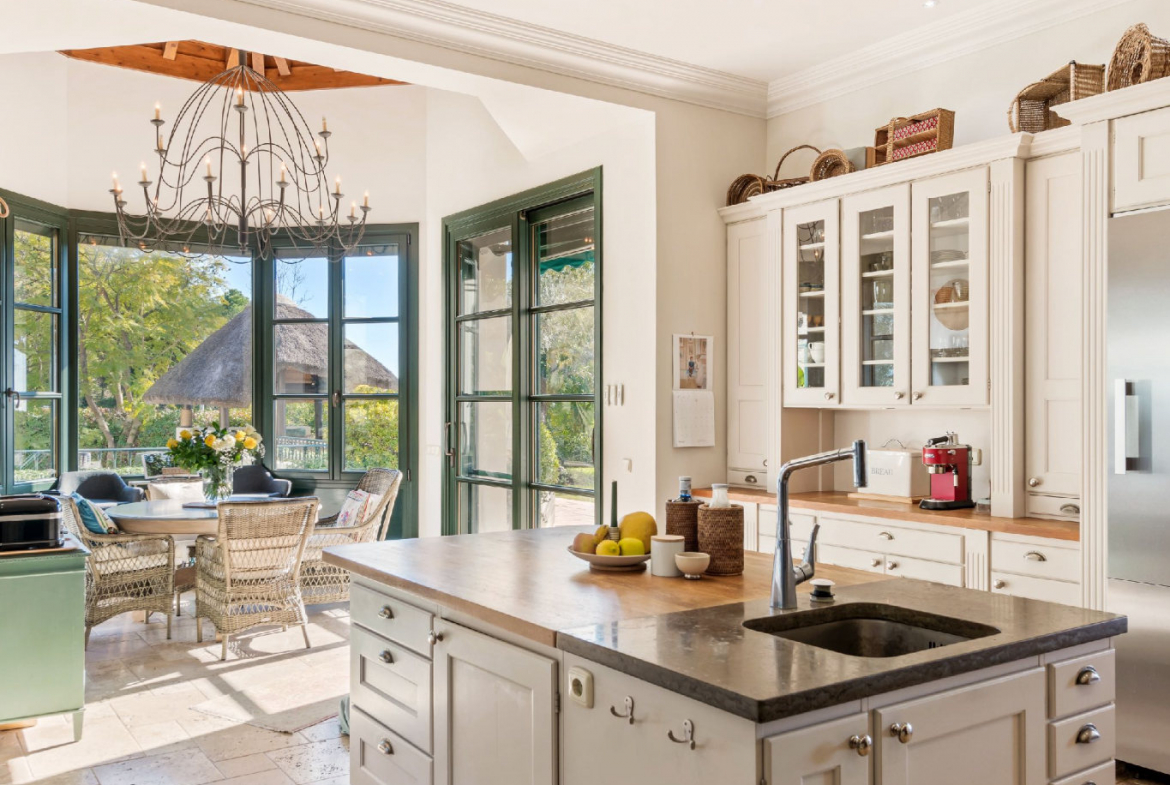 The kitchen follows a classic full-size design and includes an AGA-style oven, a central island with integrated sink, multiple dishwashers, extensive cabinetry, and generous preparation surfaces. A dedicated breakfast area further complements the space. Moreover, the property integrates a comprehensive security system, reinforcing peace of mind.