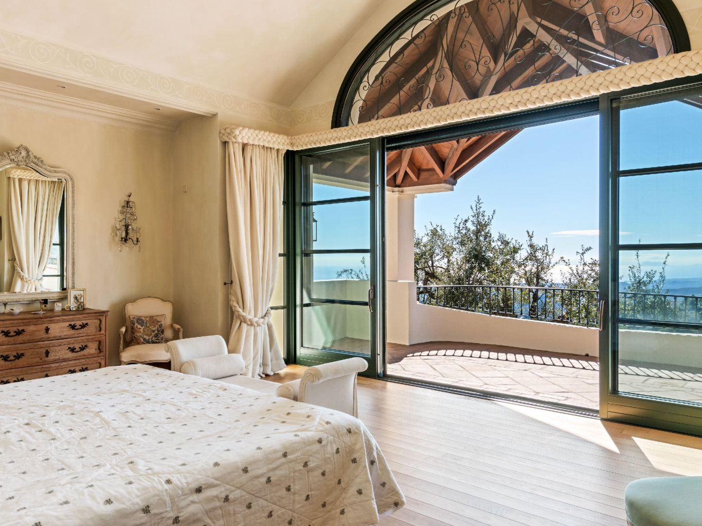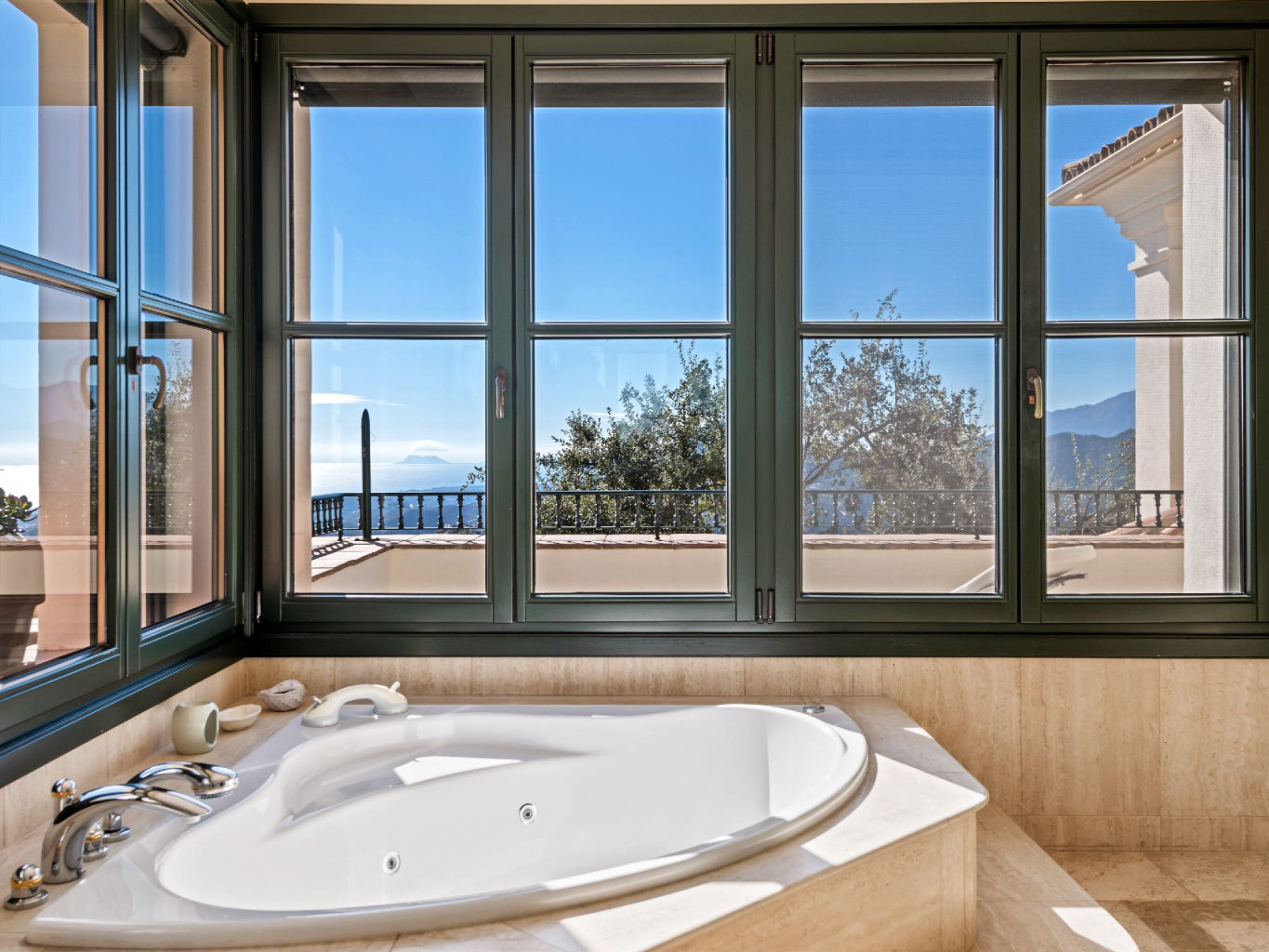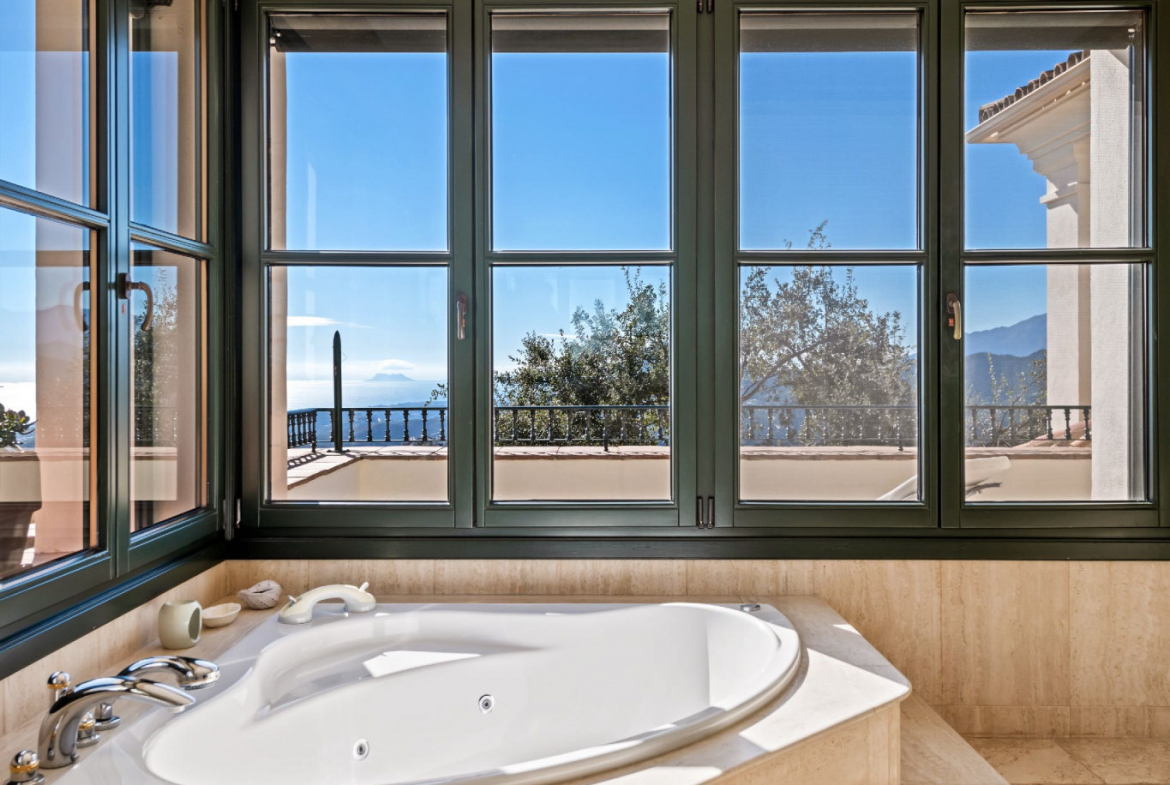 Upon entering the residence, the interior immediately frames the distant views of Gibraltar and the Mediterranean. To the right, a private bedroom wing accommodates three exceptionally spacious en-suite bedrooms. Each bedroom includes a walk-in wardrobe and a full bathroom with separate shower and bathtub. Furthermore, this wing benefits from an independent entrance, allowing guests or family members to circulate freely. A lift conveniently connects all three floors, enhancing accessibility and comfort.