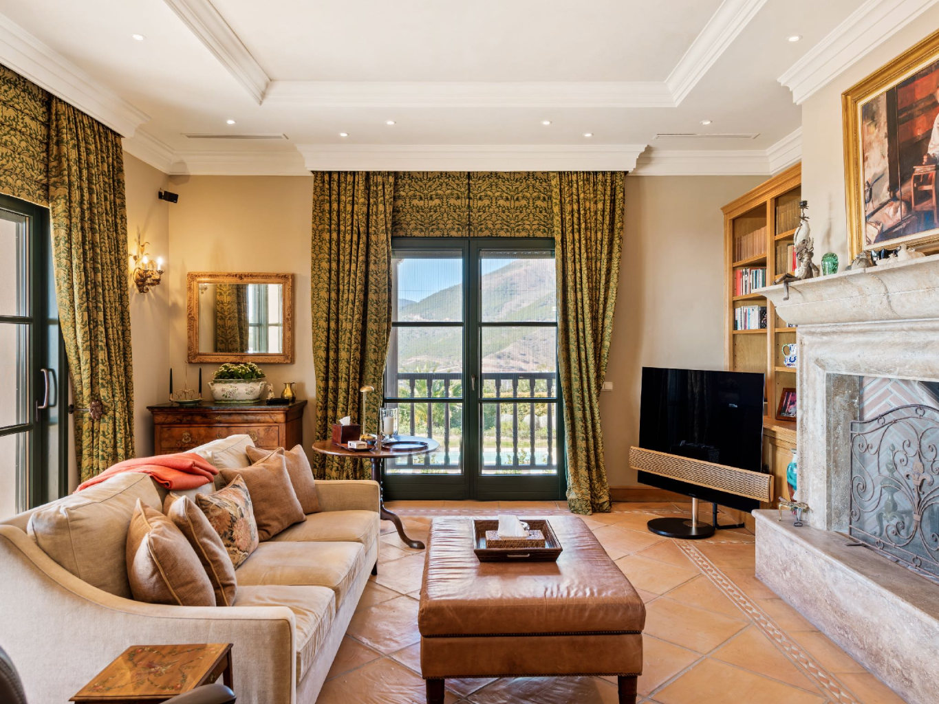 The main living areas emphasize both elegance and functionality. The spacious lounge features a two-way fireplace shared with the formal dining room. Large terrace doors open onto panoramic outdoor spaces. In addition, a separate snug or TV room offers flexibility and privacy when needed. The dining area comfortably seats twelve guests, making it ideal for entertaining.