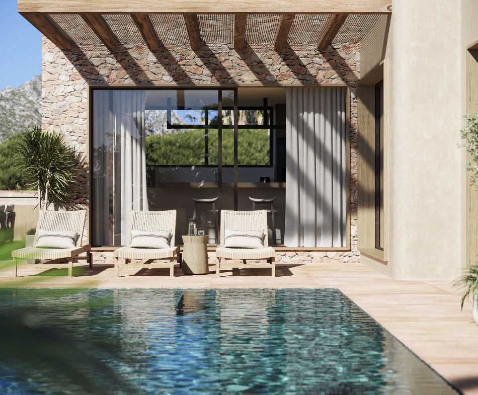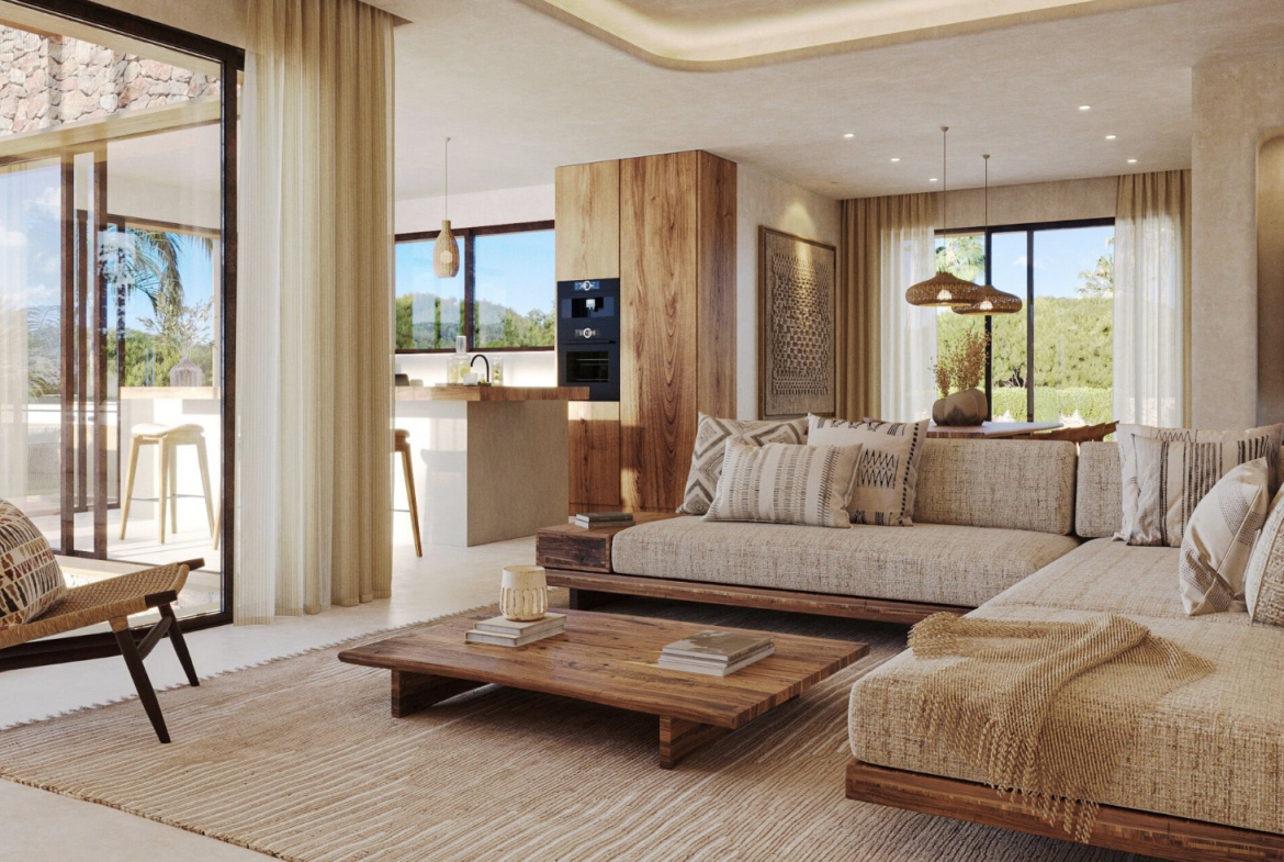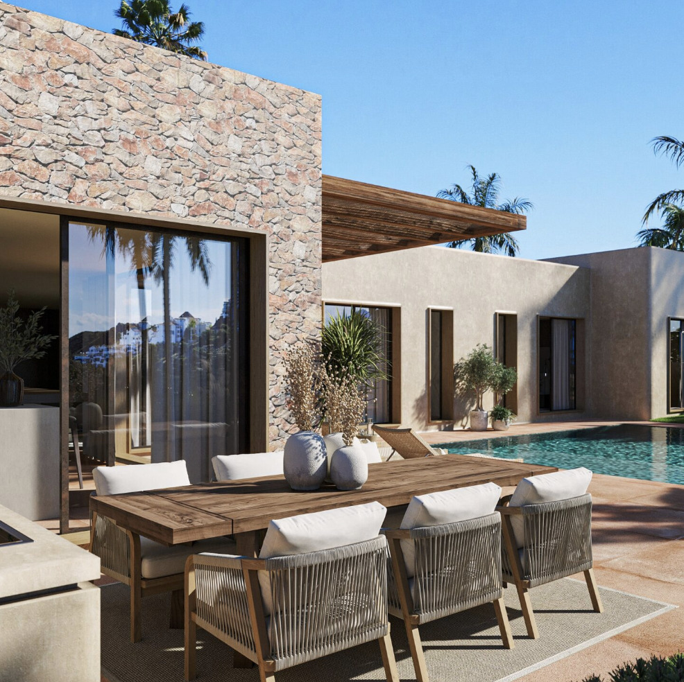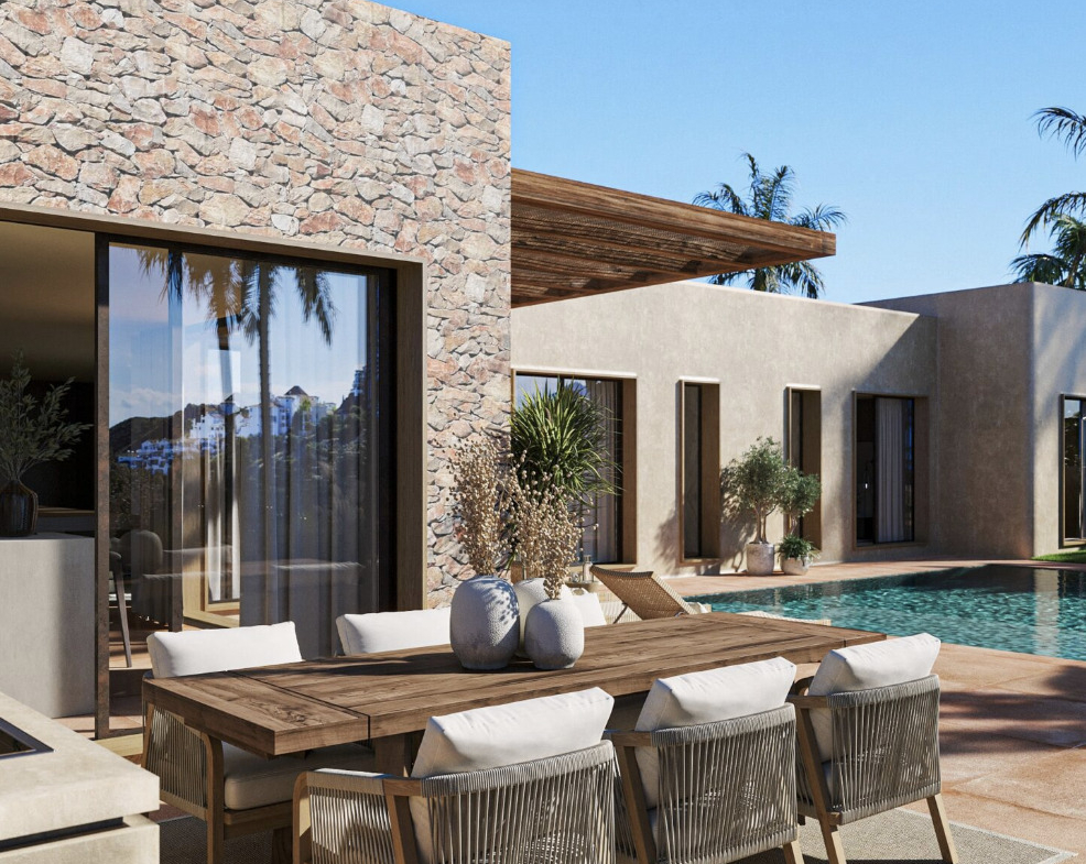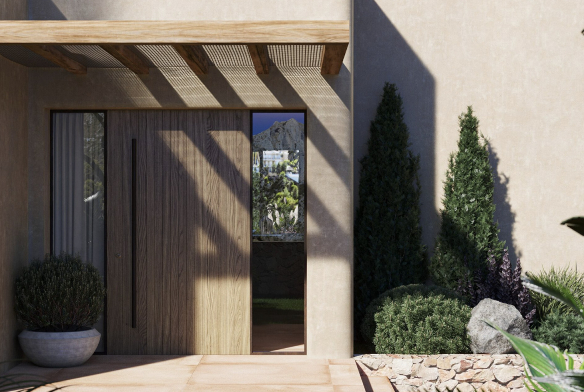 The outdoor spaces have been designed with the same attention to detail as the interior and invite you to fully enjoy the Mediterranean climate. Two elegant pergolas provide shade and character, one located at the front of the house and the other next to the living room and kitchen.