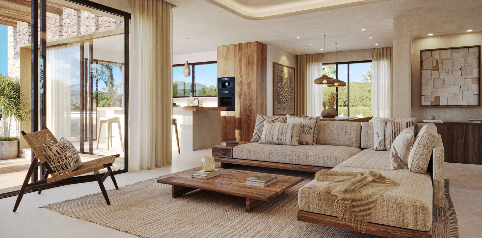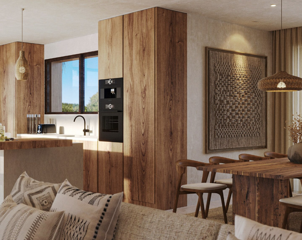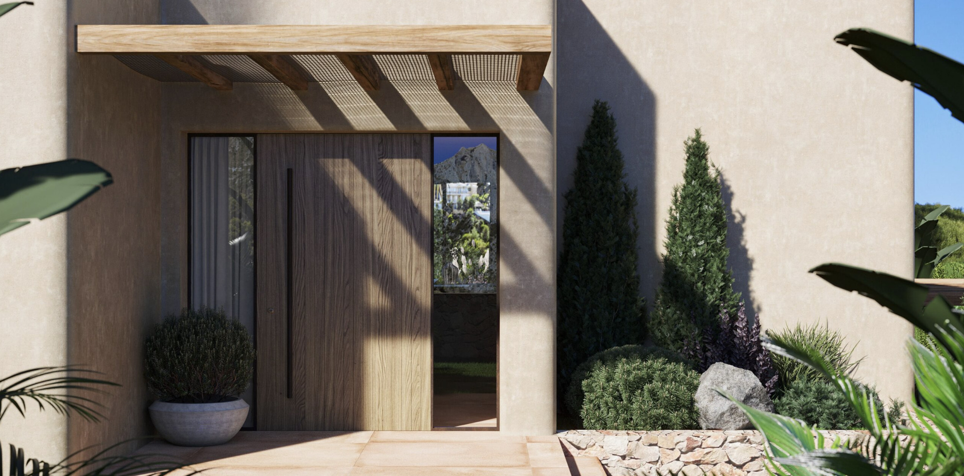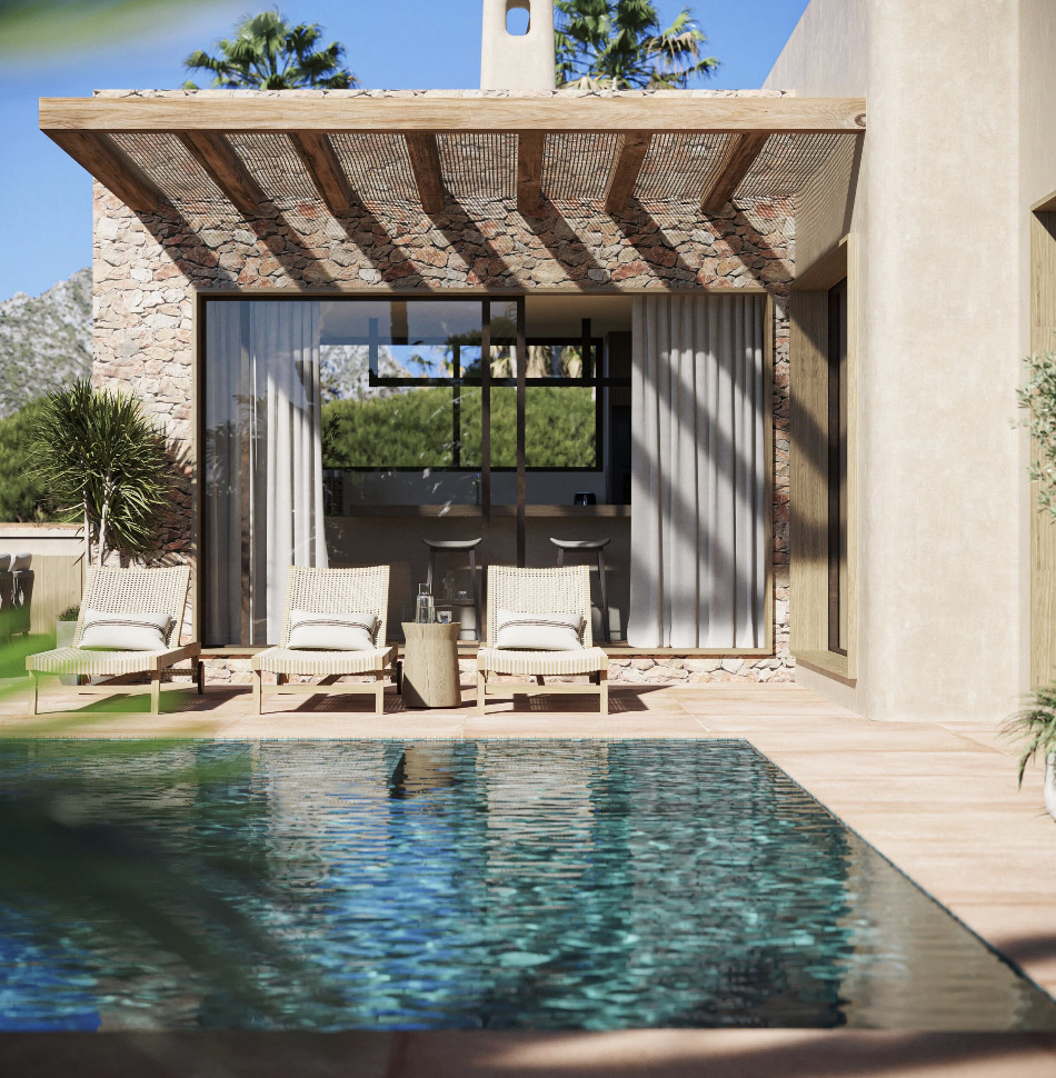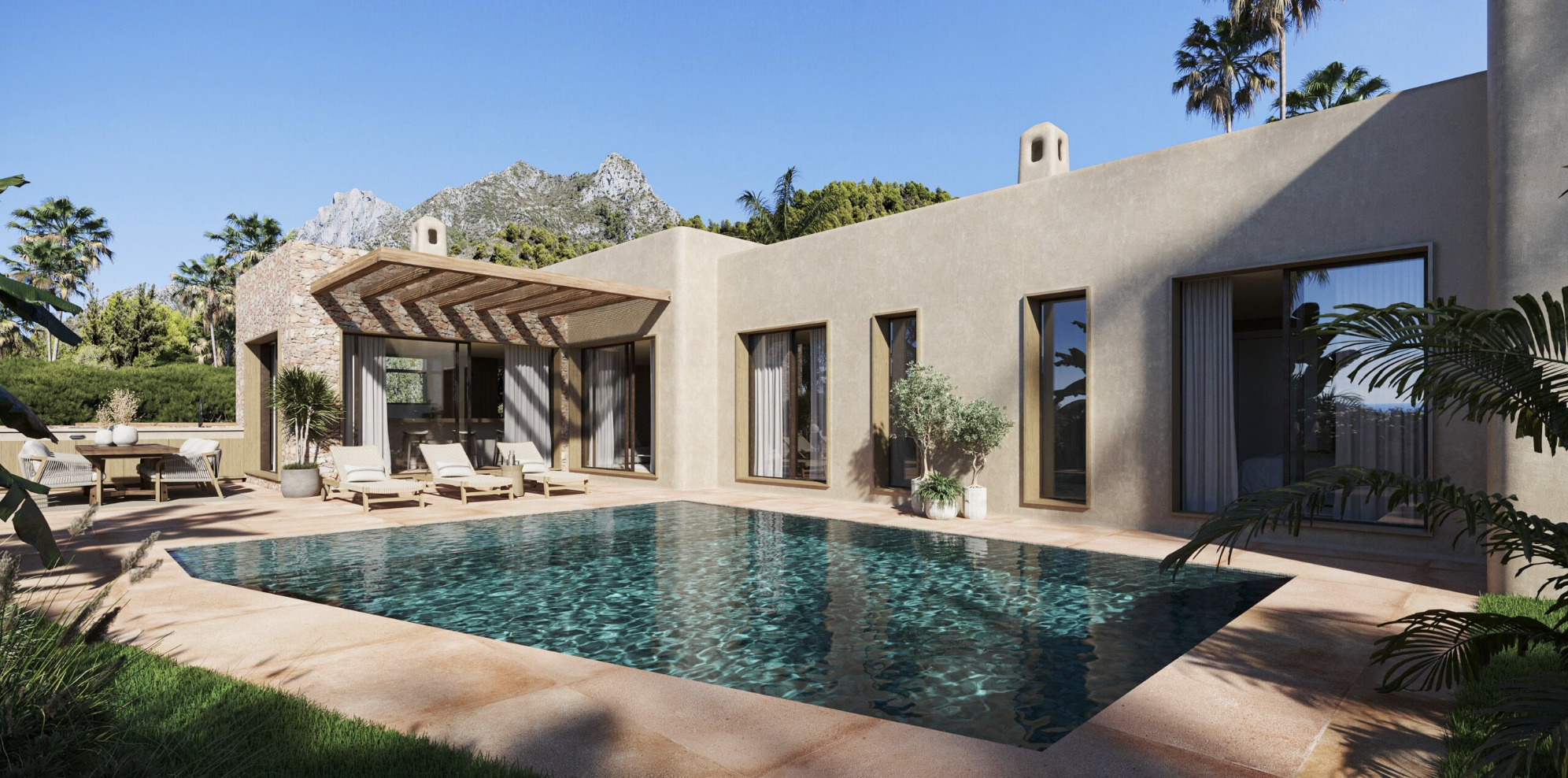 The outdoor spaces have been designed with the same attention to detail as the interior and invite you to fully enjoy the Mediterranean climate. Two elegant pergolas provide shade and character, one located at the front of the house and the other next to the living room and kitchen.