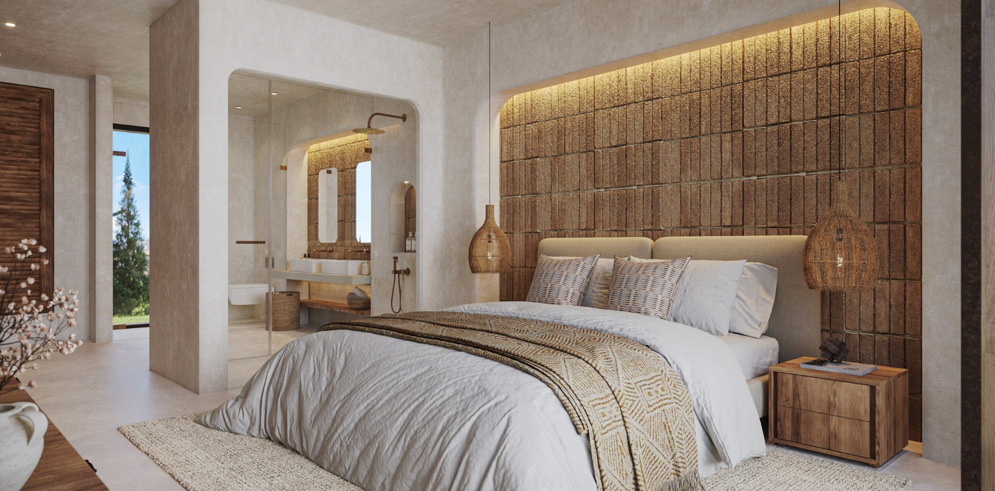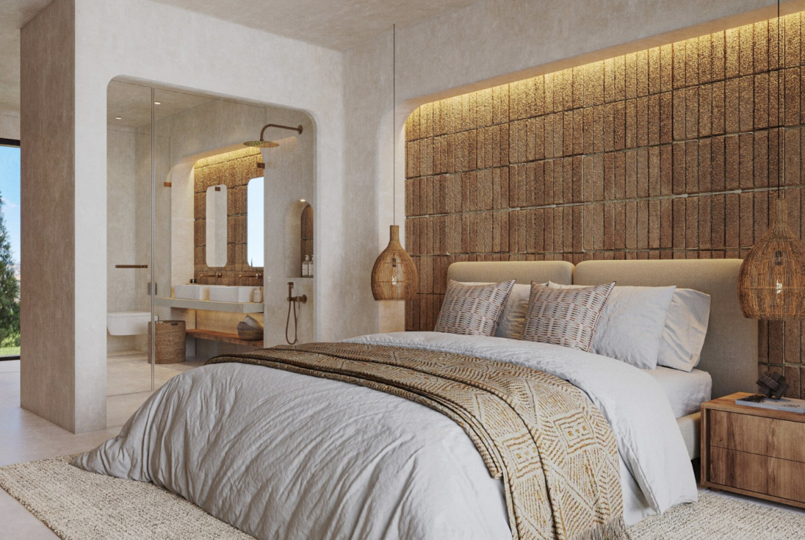 The master suite offers a peaceful and relaxing atmosphere with views of the garden and direct access to the terrace, creating a private retreat within the home.