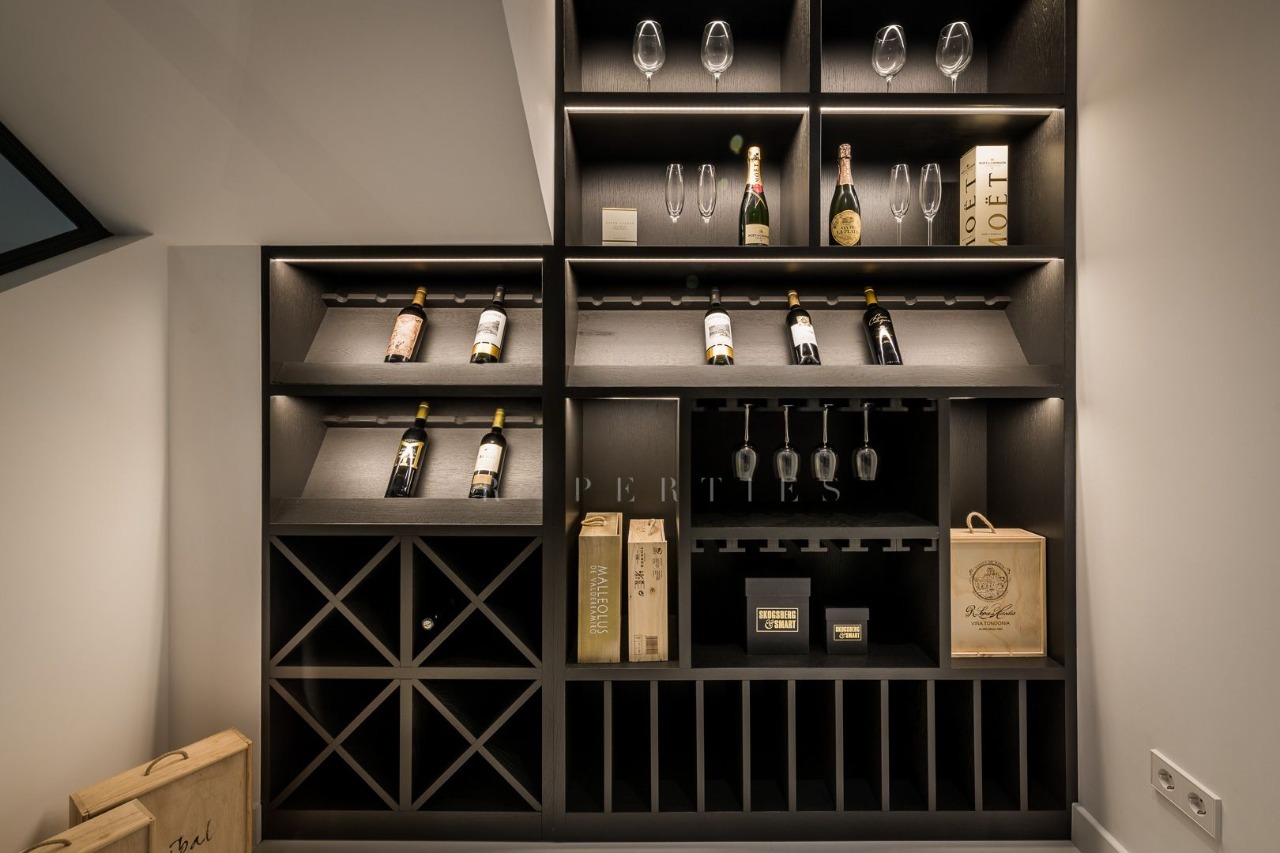 Lower level of the villa features one guest bedroom en-suite, further bedroom, two guest bathrooms, a wine cellar, a gymnasium, a cinema room, a sauna, a storage room, a laundry room, a machinery room, a private garage for two cars and a multipurpose room.