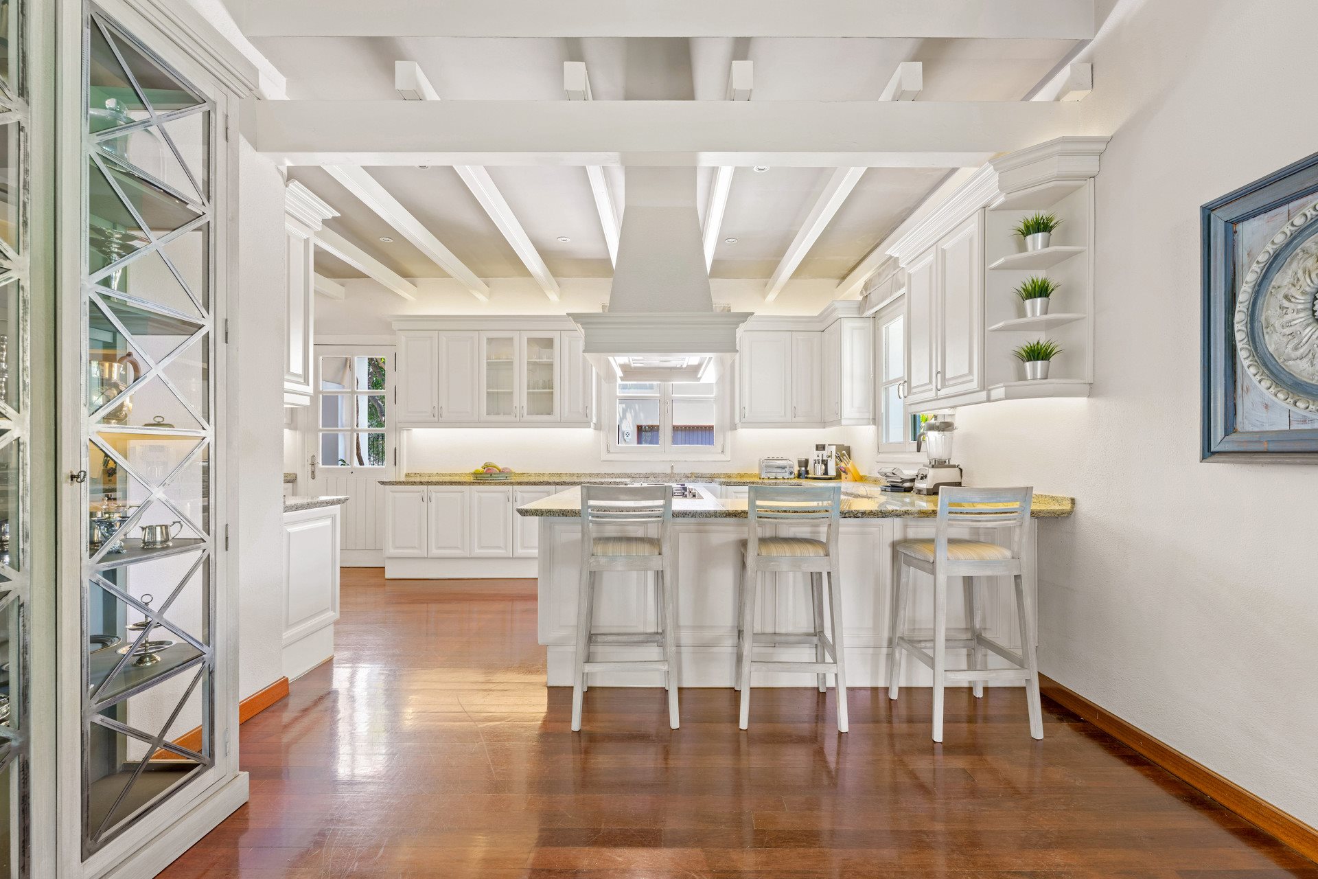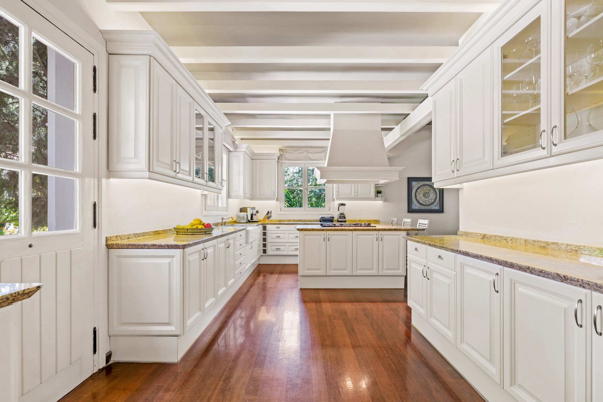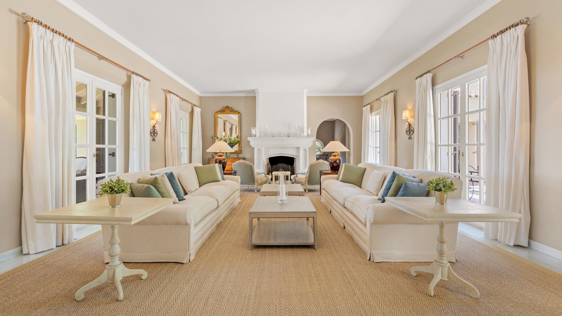 Opposite, French doors lead to a peaceful courtyard finished with hand-laid pebbles from Granada. Moreover, this detail highlights the craftsmanship throughout the home.