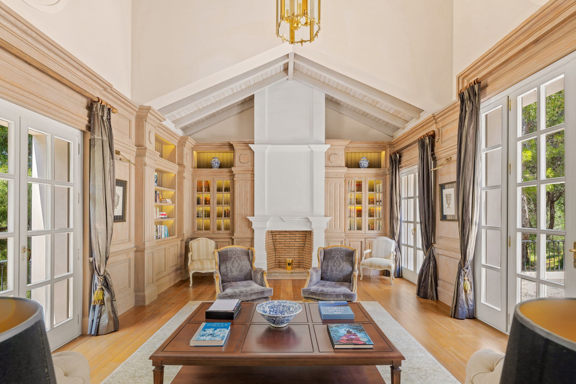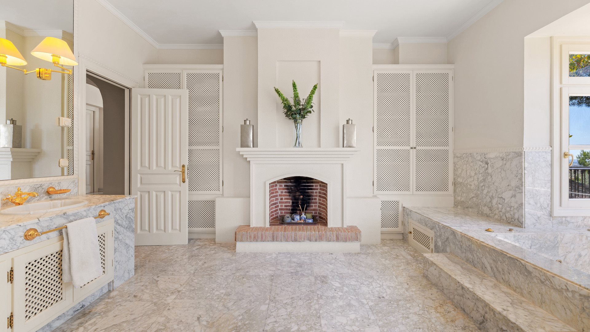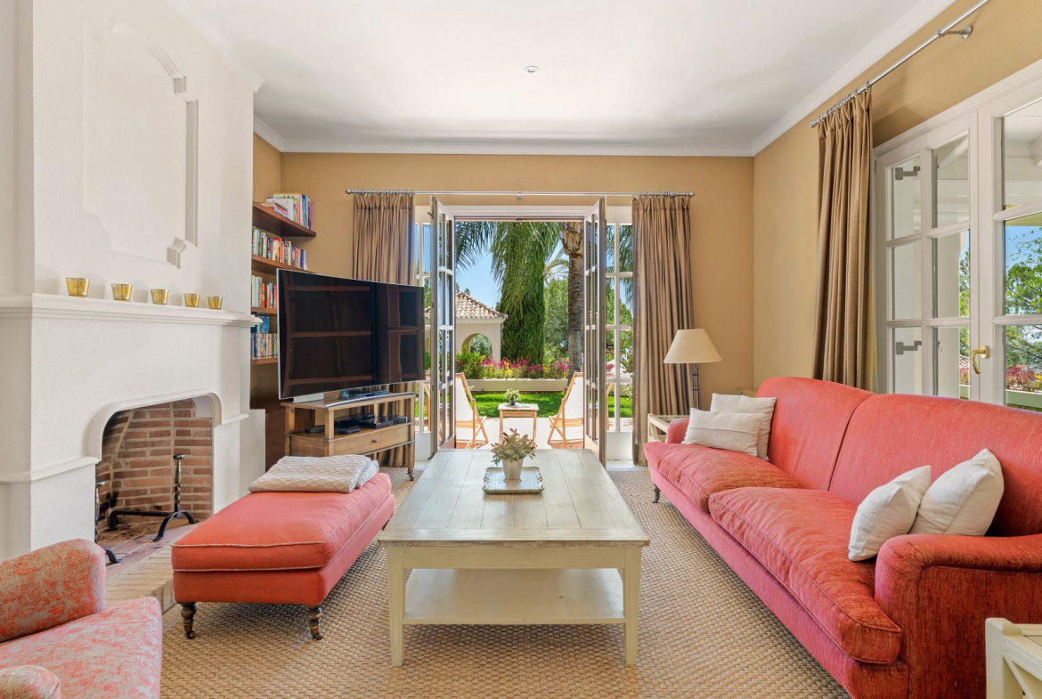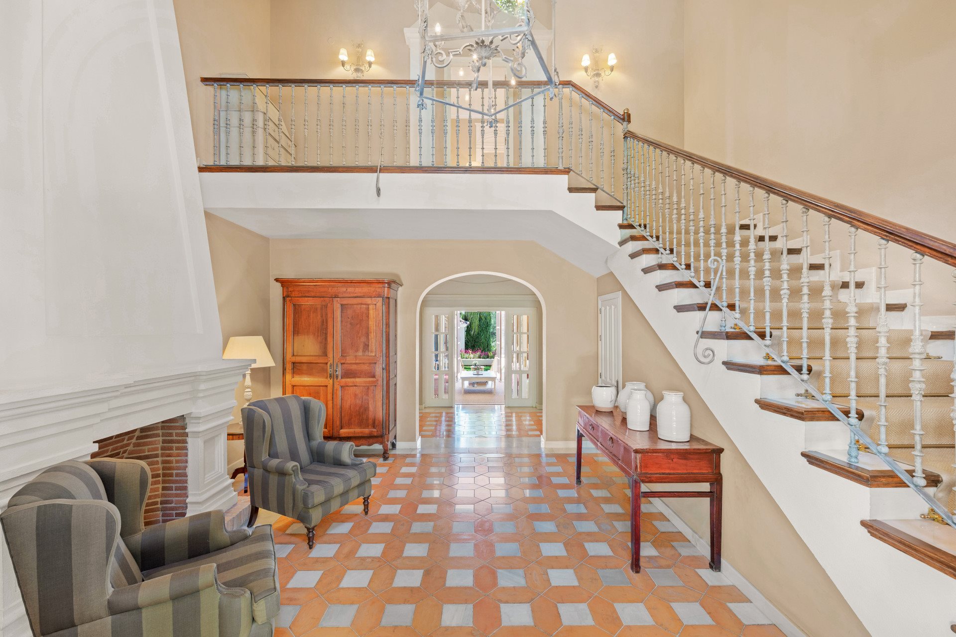 Inside, a dramatic triple-height entrance hall with a fireplace creates an immediate sense of grandeur. Consequently, the interiors reflect refined Andalusian charm combined with warm, livable spaces.