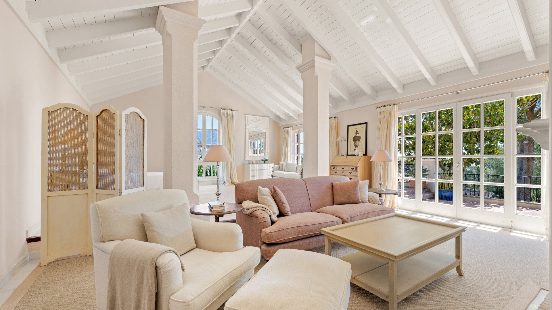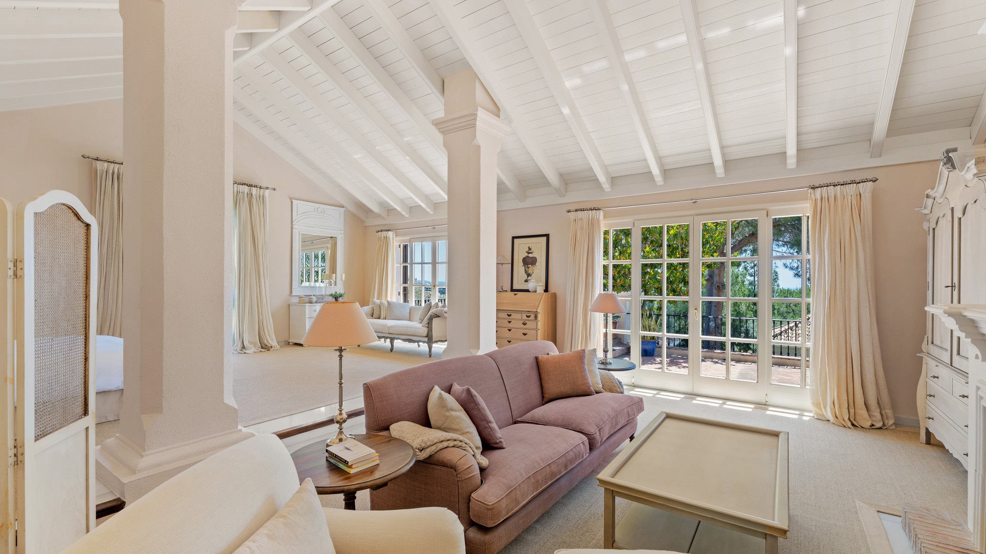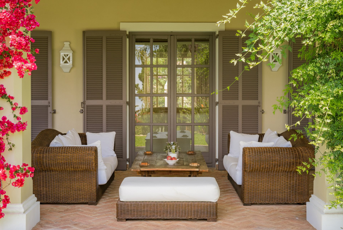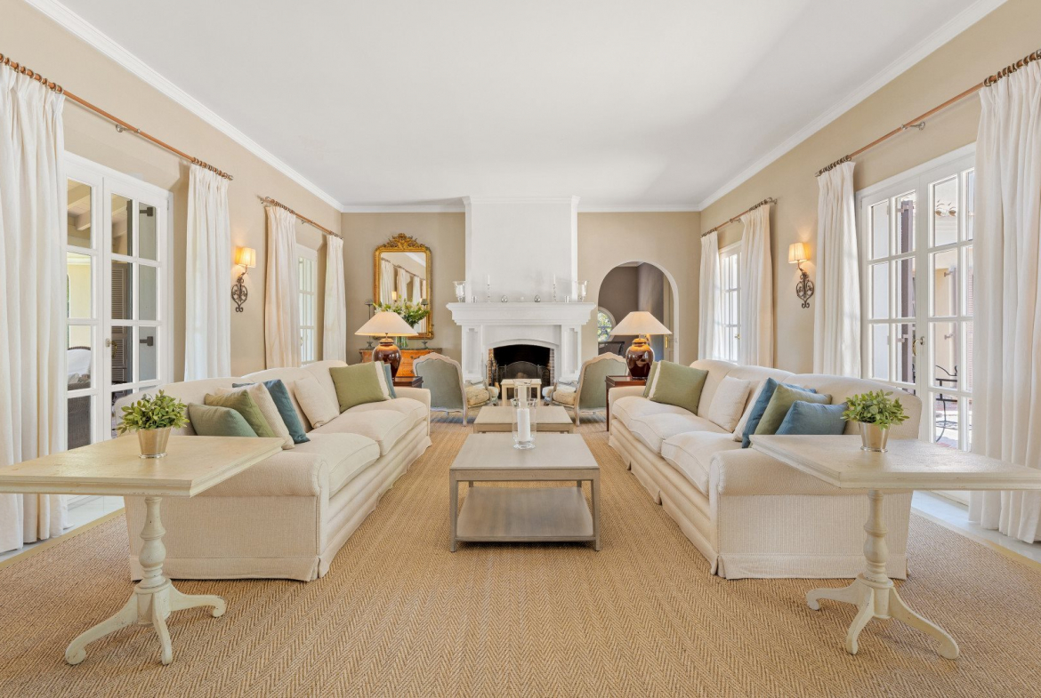 The formal living room spans approximately 70 m² and opens onto a covered terrace with timber beams. Therefore, it is ideal for year-round outdoor living.