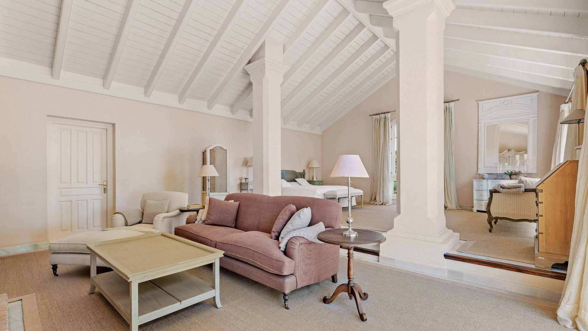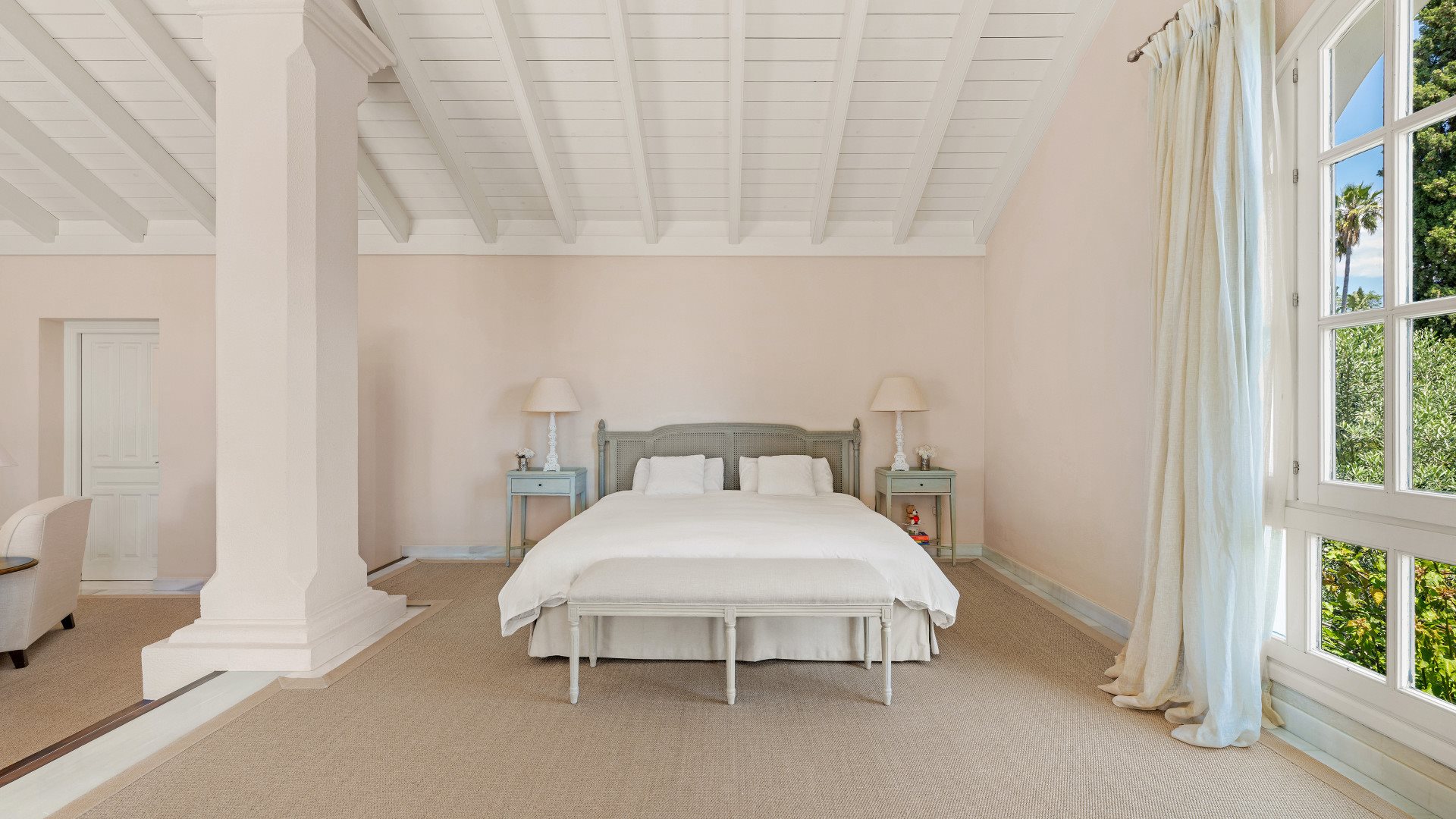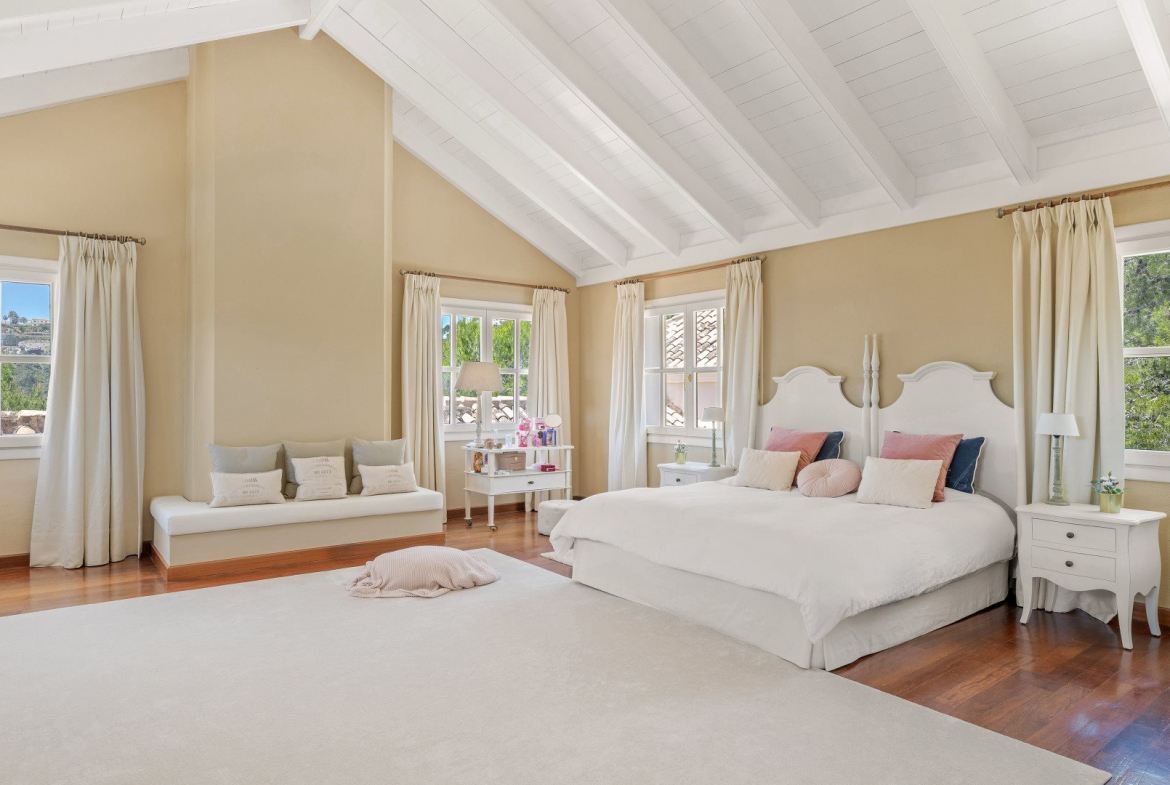 The master suite occupies a prime position on the upper level. It includes a private salon, walk-in wardrobe, fireplace, and terrace with uninterrupted sea views. Furthermore, this level features a study with vaulted ceilings and a unique double-height office with its own fireplace and balcony.