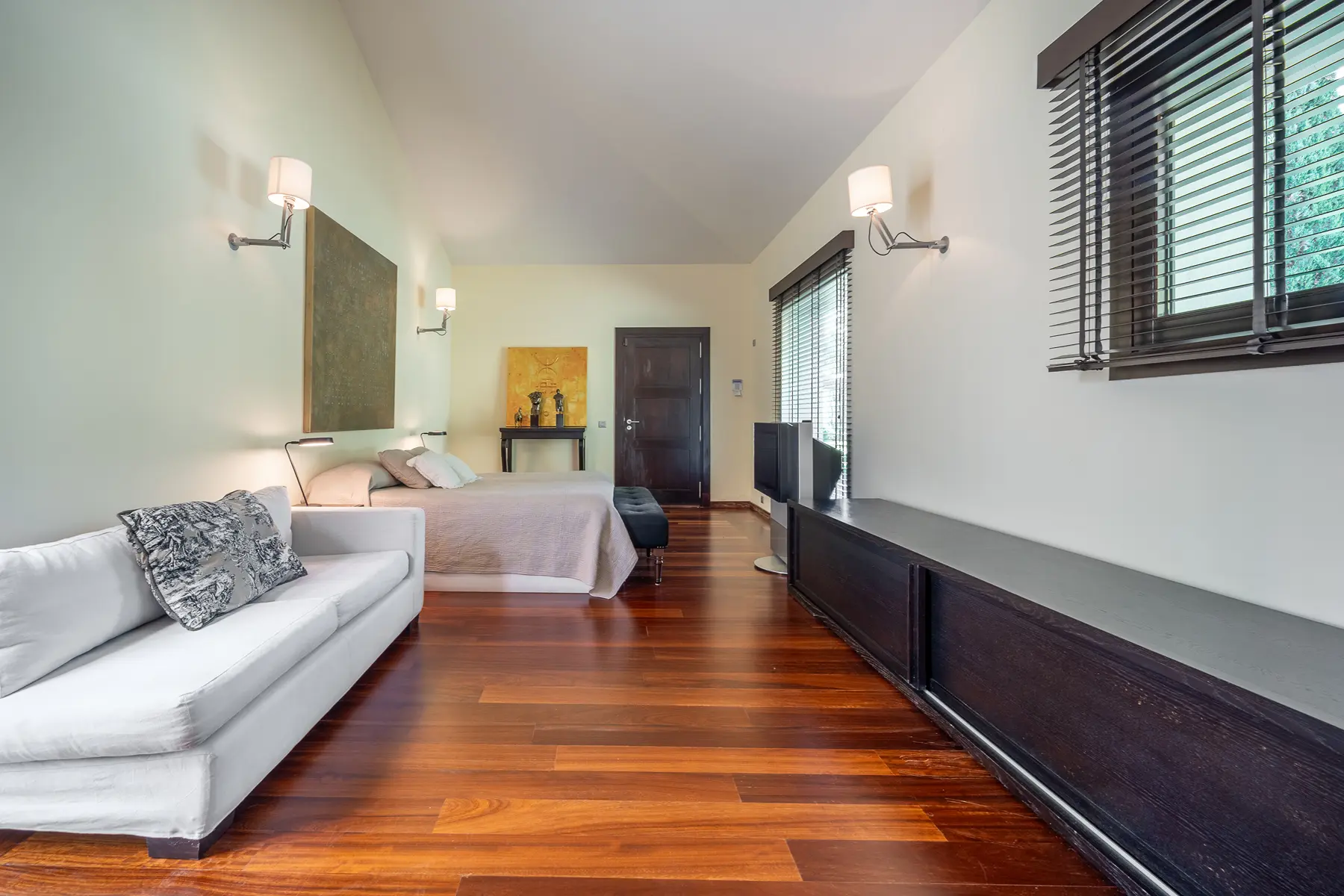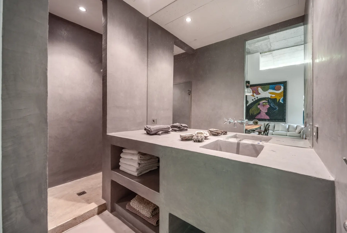 On the opposite side of the entrance hall, a bright corridor illuminated by skylights leads to the main bedroom wing. This area includes the luxurious primary suite with walk-in wardrobes and a spacious bathroom. An additional bedroom suite and a guest apartment with independent entrance, kitchenette, and bathroom also occupy this section. The wing further includes a small gym, sauna, Hammam, and a laundry room with access to a front terrace. Consequently, the layout preserves privacy while maintaining convenient access to the main living areas.