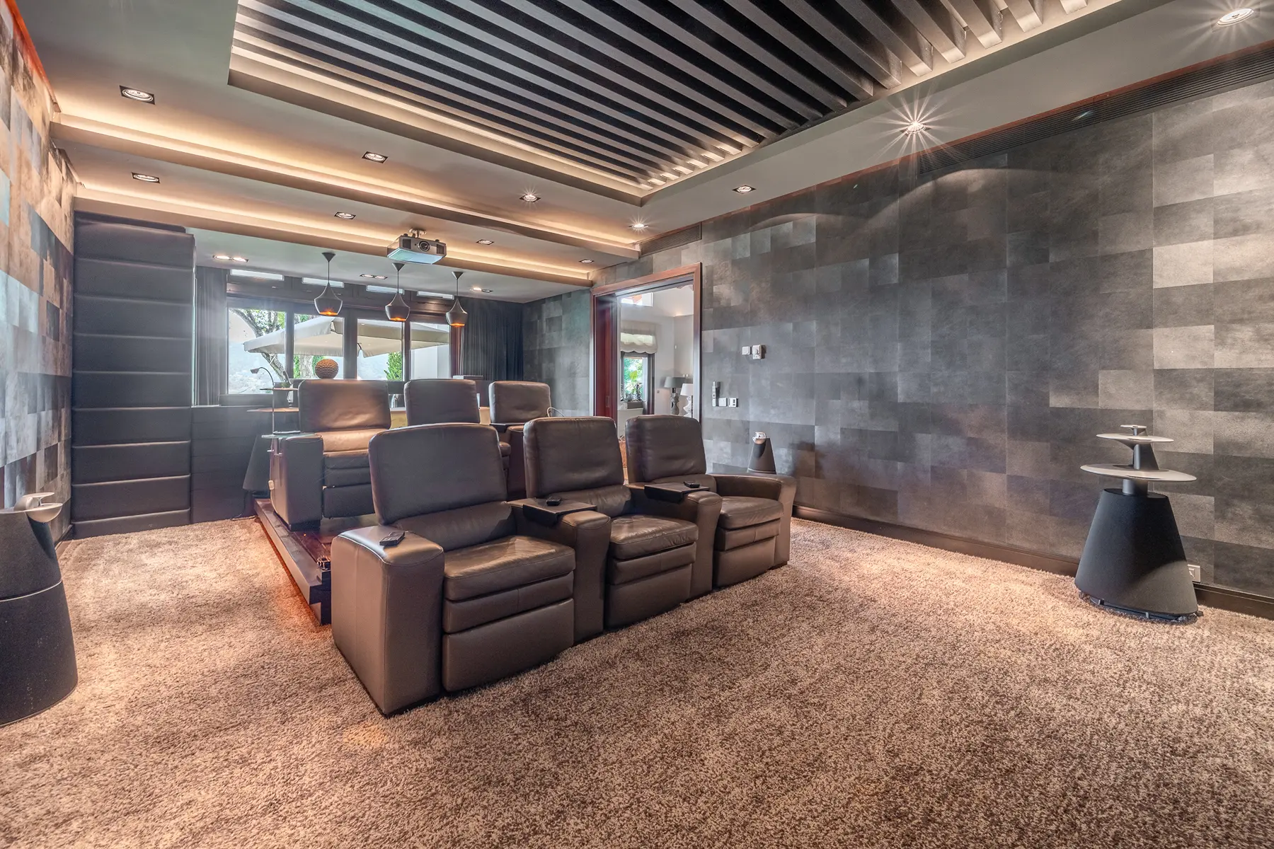 The upper level forms the heart of the residence. Here, classic Mediterranean character blends with modern comfort. The layout includes a grand entrance hall with vaulted ceiling, a spacious lounge with fireplace opening onto the main terrace, and a formal dining area connected to outdoor entertaining spaces. In addition, a separate home cinema with a bar area creates a refined leisure space.
