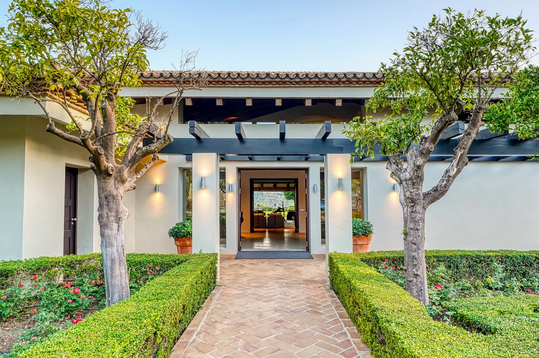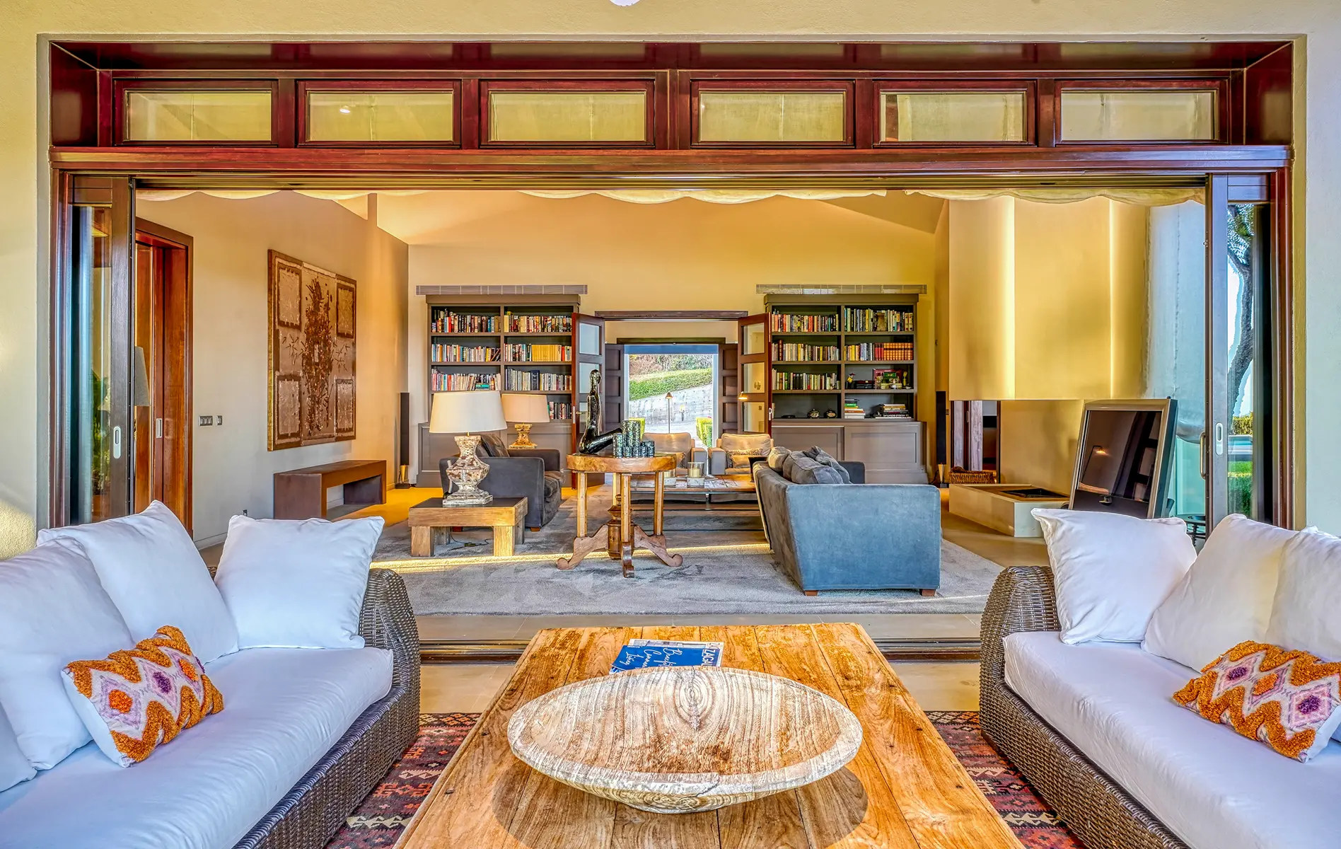 The villa sits at the end of a quiet cul-de-sac. A private driveway leads to an elegant entrance courtyard with landscaped gardens and a water feature. Nearby, a spacious parking area and a three-car garage provide convenient access. The main entrance opens into a striking natural stone hall with a vaulted ceiling. As a result, the arrival immediately conveys a sense of scale and elegance.