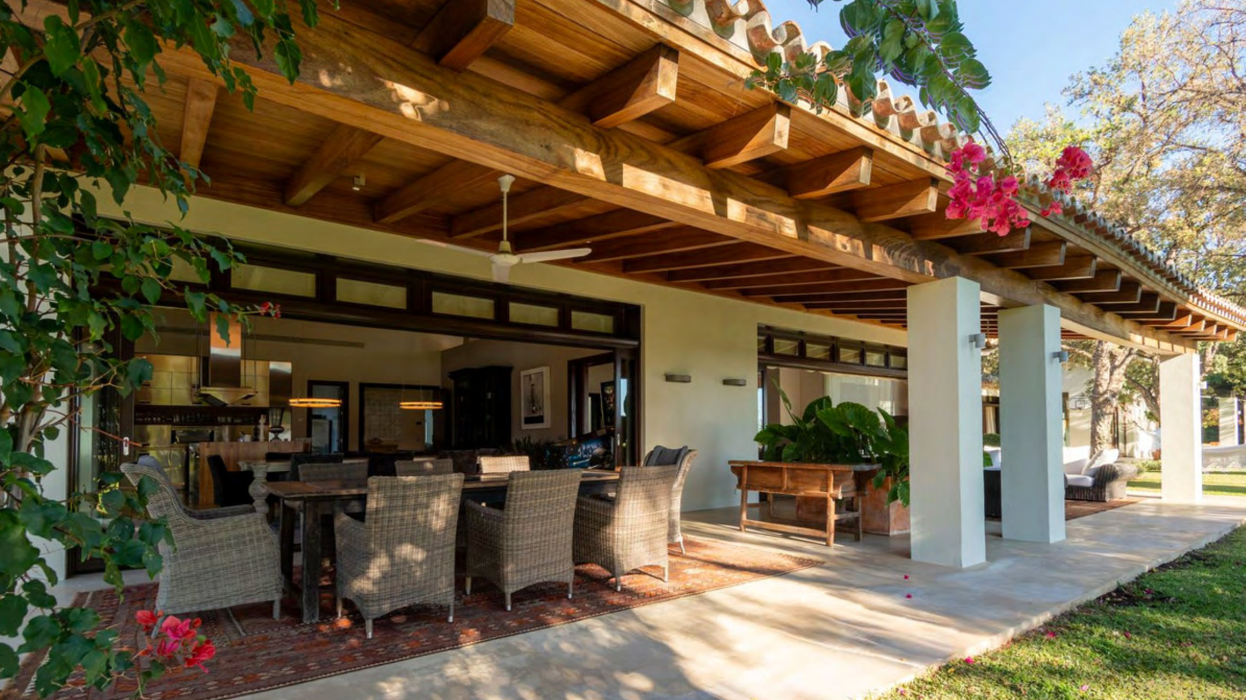 The fully equipped Gaggenau kitchen features professional appliances and connects to a central dining area with exposed wooden beam ceilings. A practical utility zone includes a walk-in refrigerator and storage. Furthermore, a private service entrance enhances functionality. The dining area opens onto both the principal terrace and a separate breakfast terrace with pergola and outdoor kitchen, ideal for alfresco dining.
