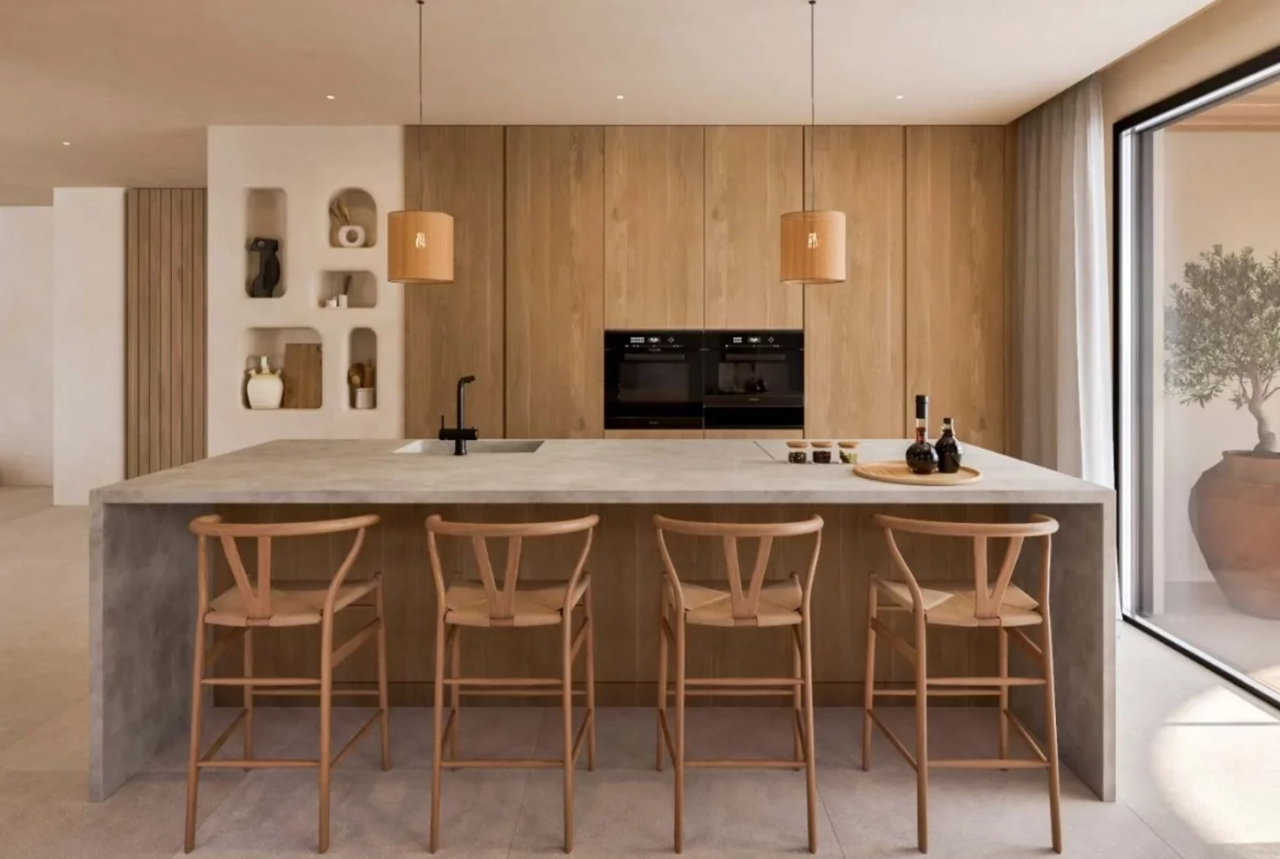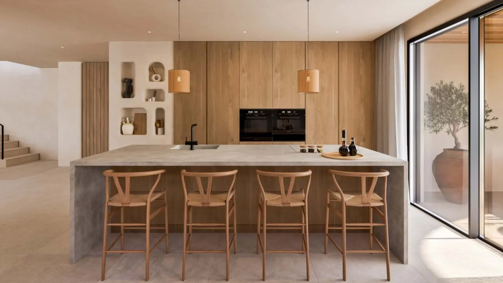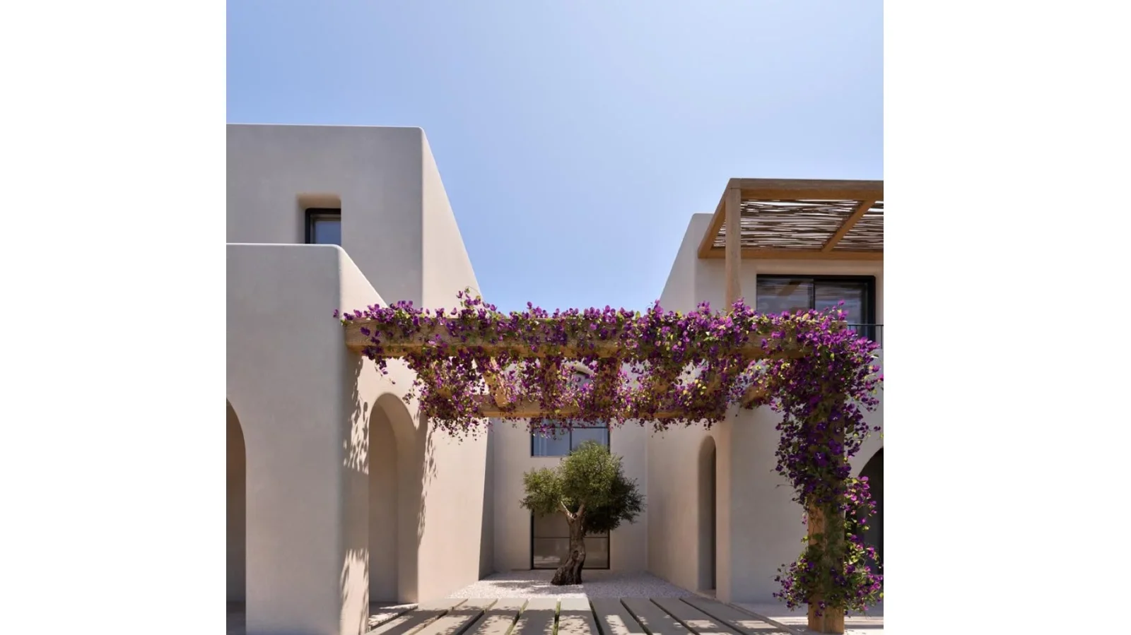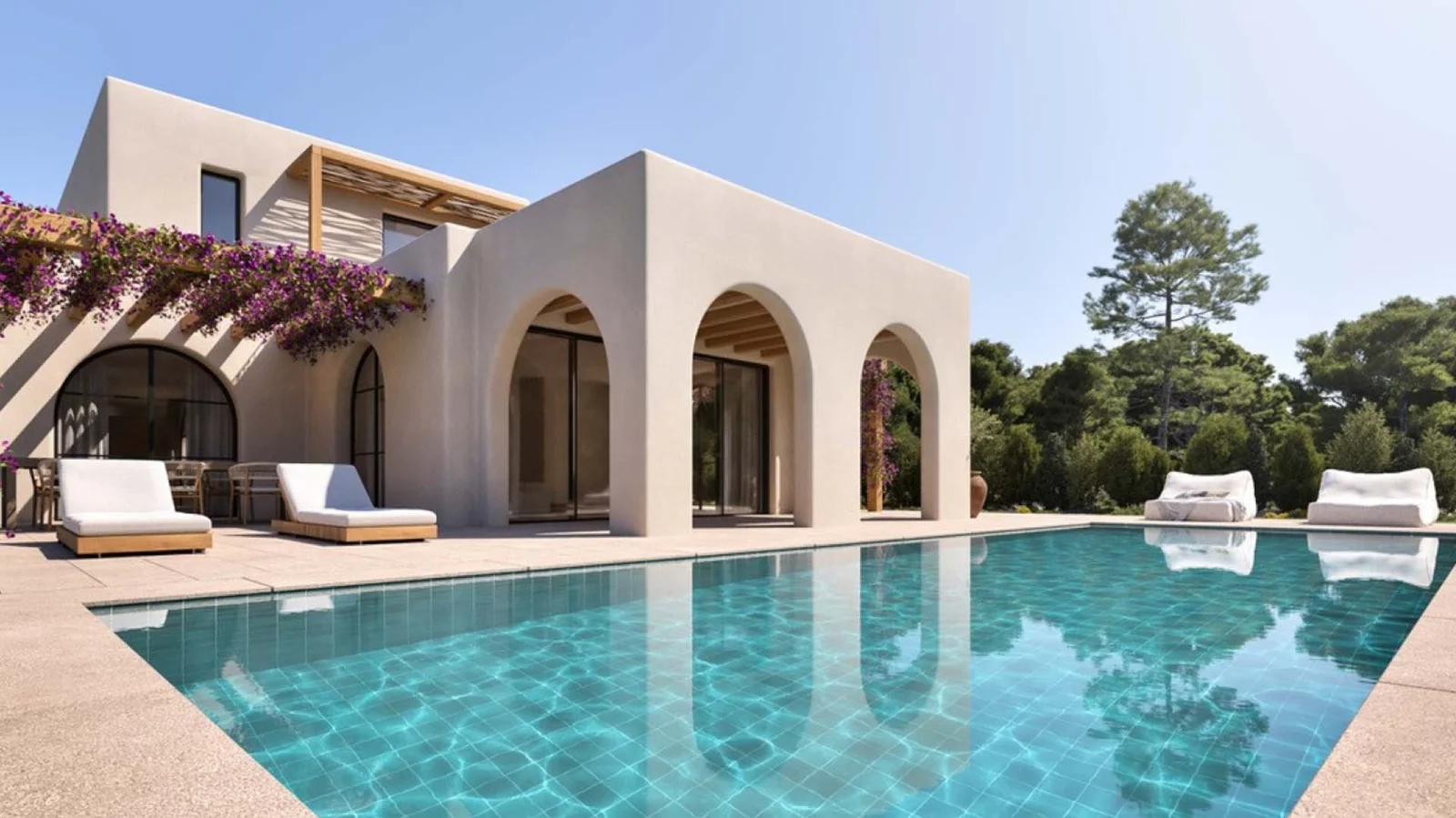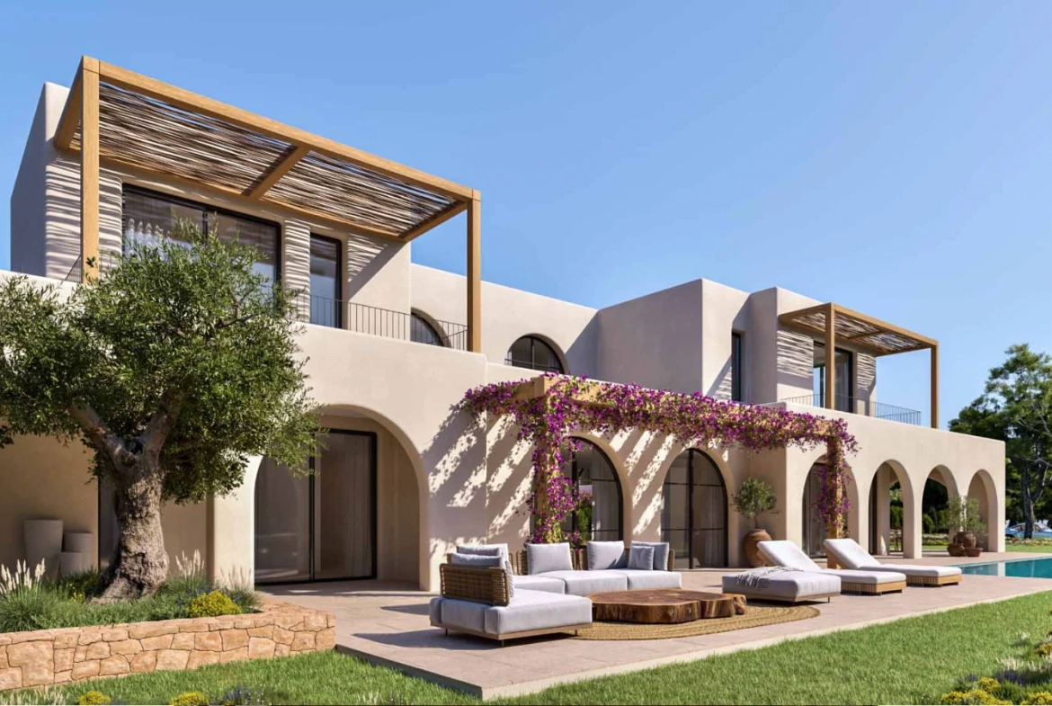 These villas combine modern architectural design with timeless coastal character. Natural stone accents, wooden pergolas, and elegant arched nayas create a warm and refined atmosphere.