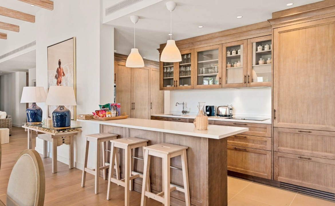 The villa comprises of a large open plan living room with separate dining area with table for 8, lounge with comfortable sofas and a fireplace and a fully fitted modern kitchen with a lovely breakfast bar all with access, through large glass floor-to-ceiling doors, to the ample terraces with separate areas to eat, enjoy the sunshine or just lounge and enjoy the whispers of nature.