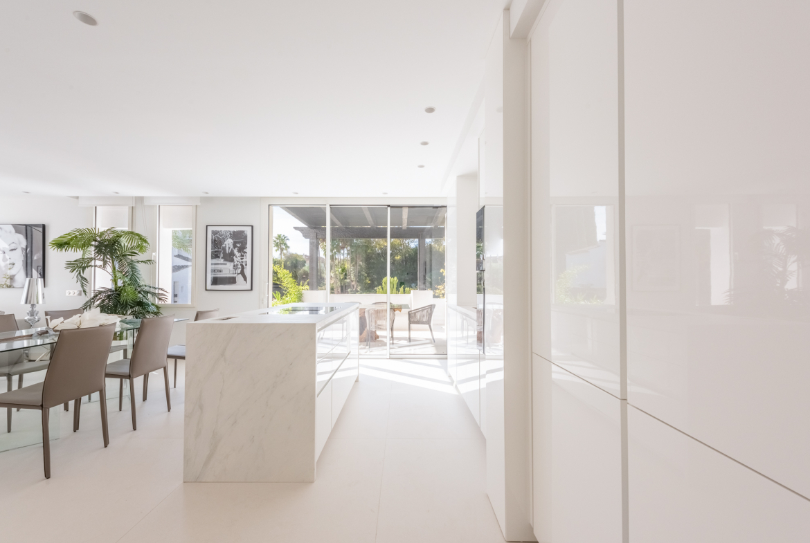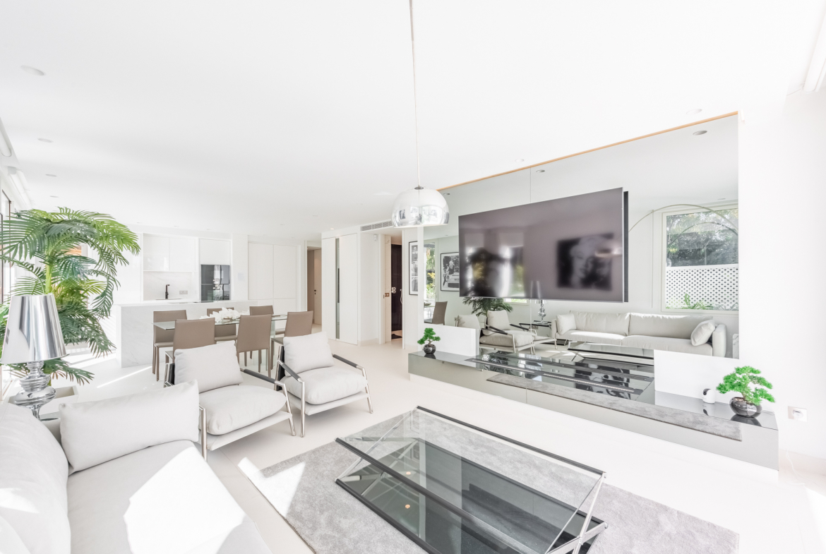 Fully refurbished in 2022, the apartment combines contemporary design with abundant Mediterranean light. Floor-to-ceiling windows and a dual orientation enhance both brightness and natural airflow. In addition, air conditioning and underfloor heating ensure year-round comfort. The open-plan living and dining area flows seamlessly into a modern kitchen equipped with premium Gaggenau appliances, creating a functional and elegant central living space.
