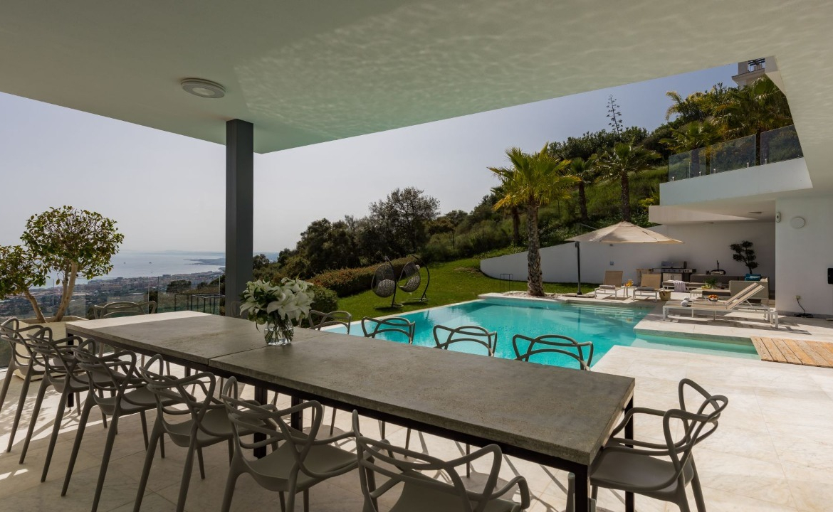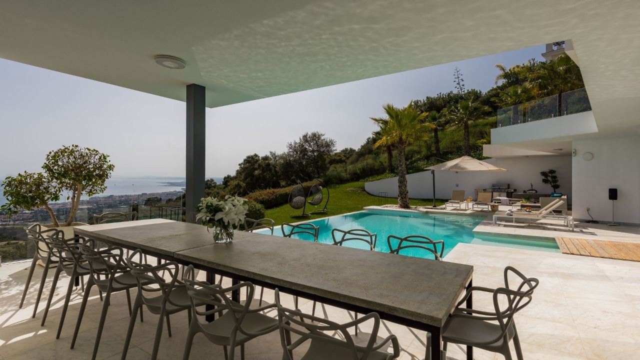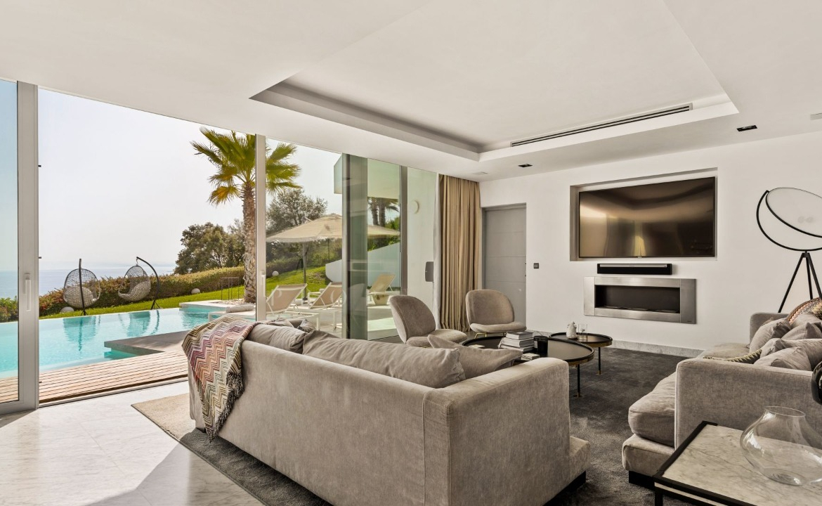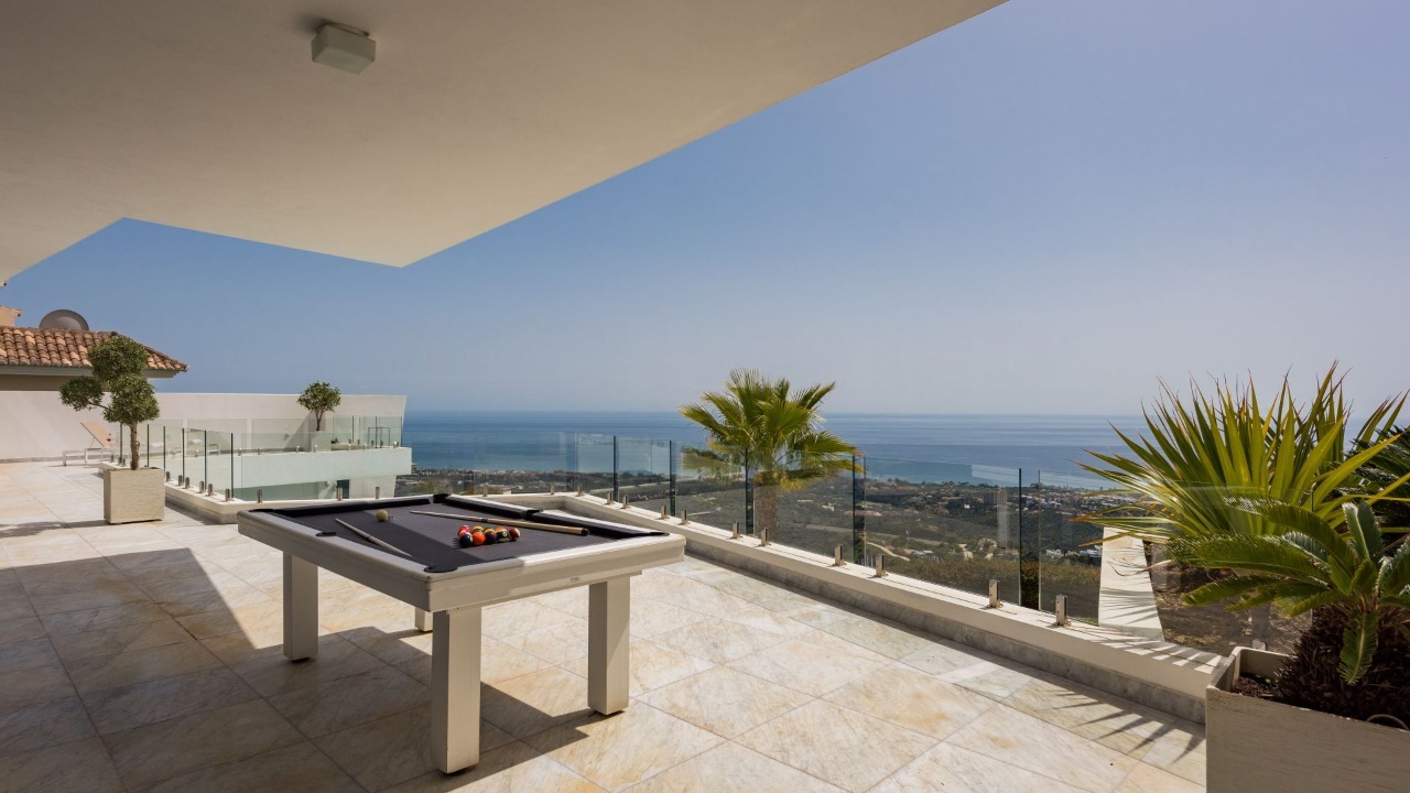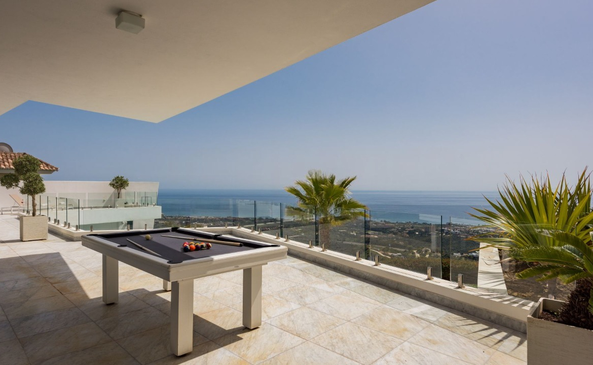 The villa boasts of two ample terraces with breathtaking views, one of them has a pool table and a ping pong table. Outdoor area comprises of a heated infinity pool, manicured garden with sun loungers, barbecue and dining patio for fourteen people to enjoy al-fresco dinner.
