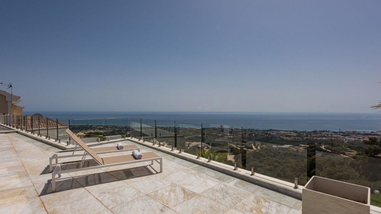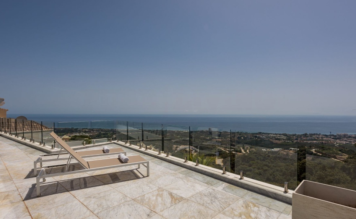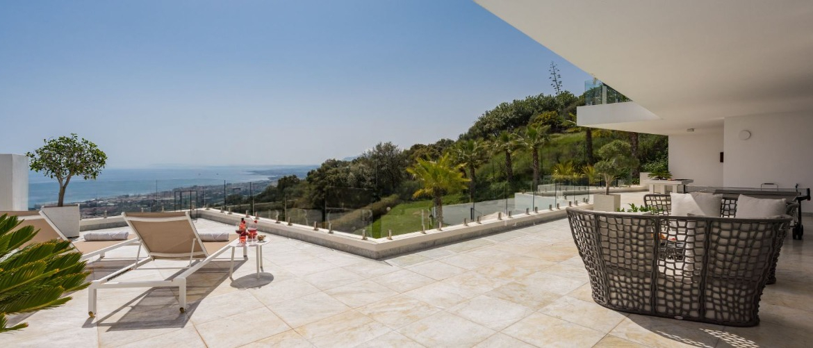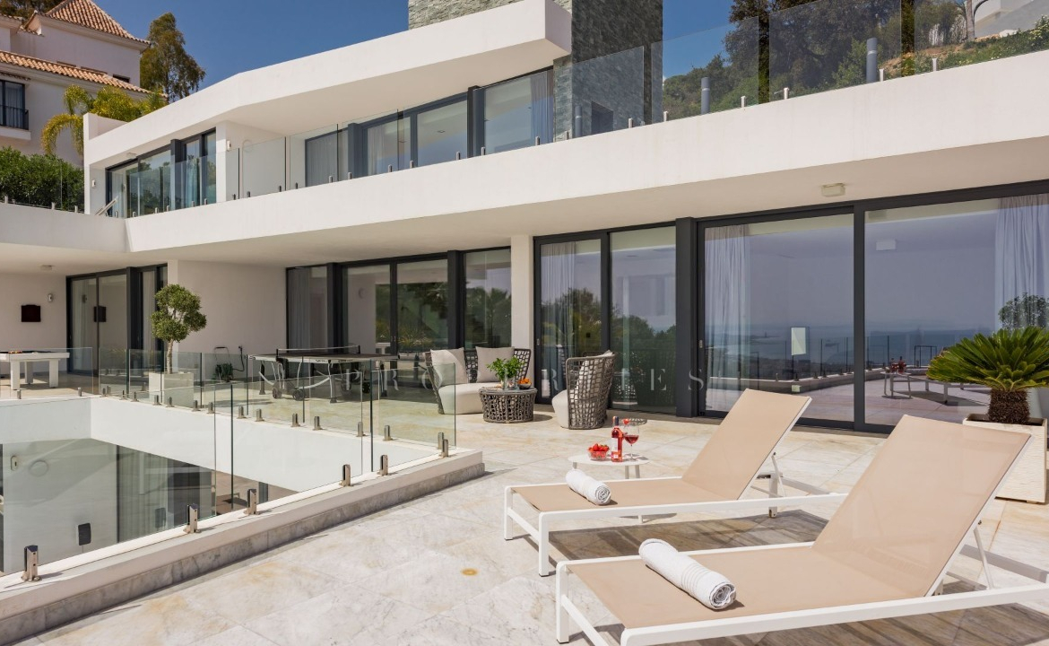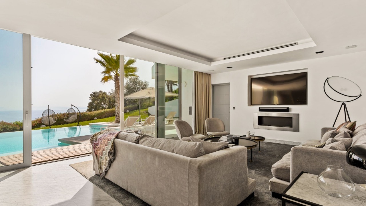 The villa boasts of two ample terraces with breathtaking views, one of them has a pool table and a ping pong table. Outdoor area comprises of a heated infinity pool, manicured garden with sun loungers, barbecue and dining patio for fourteen people to enjoy al-fresco dinner.