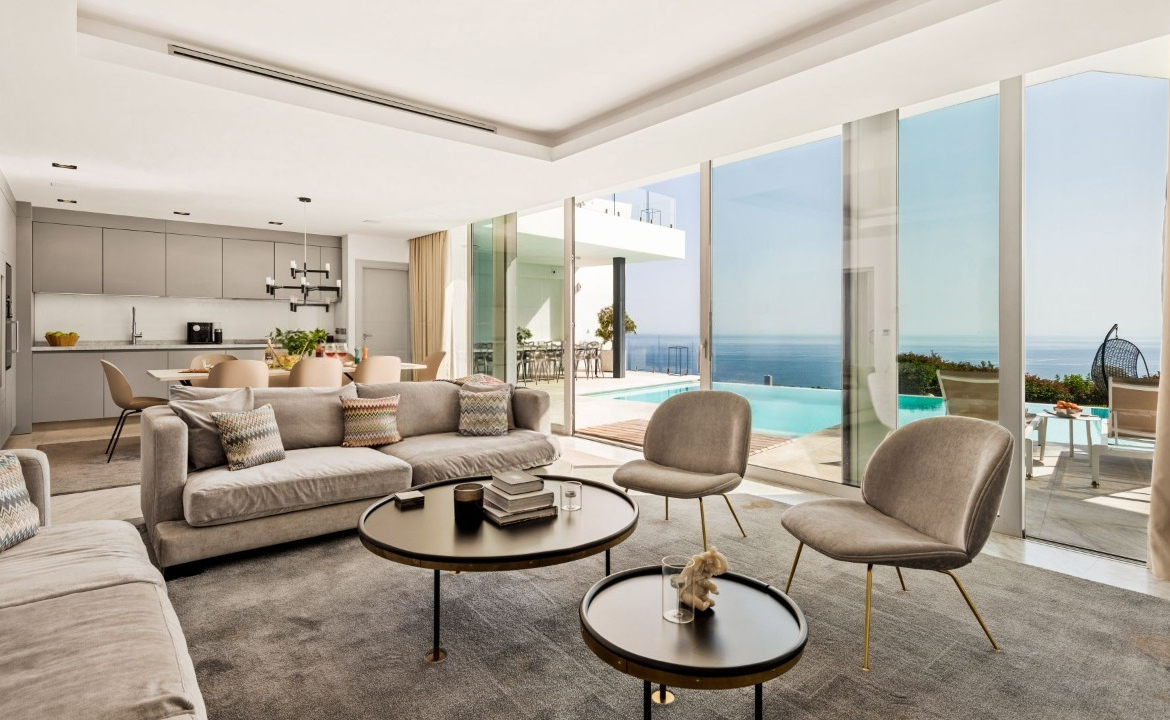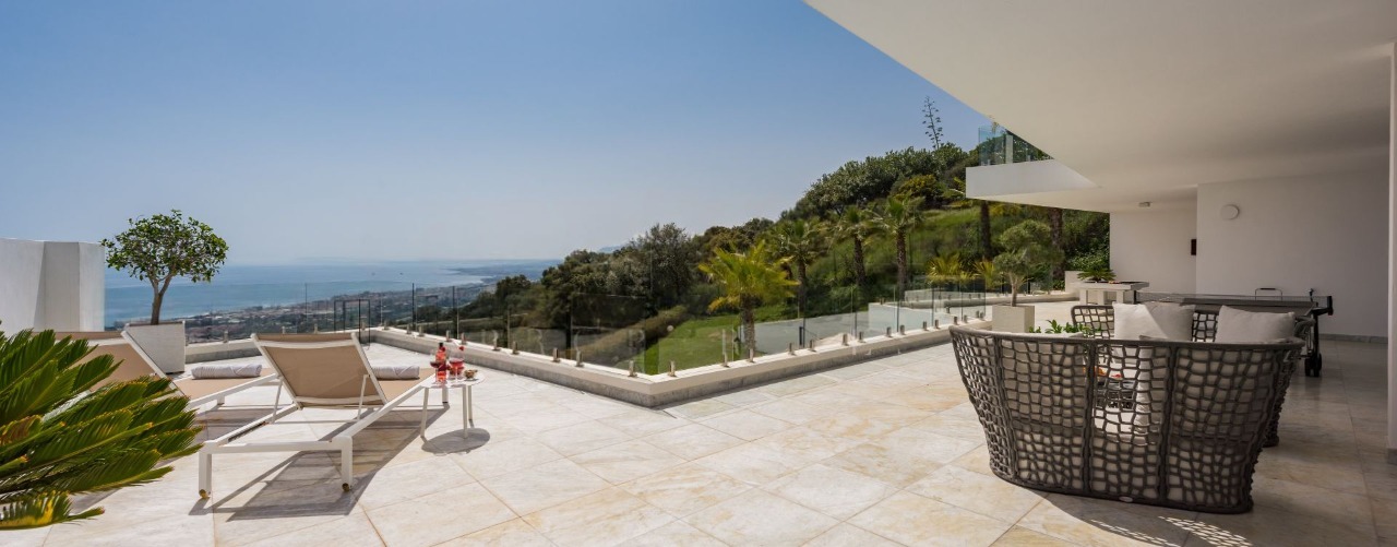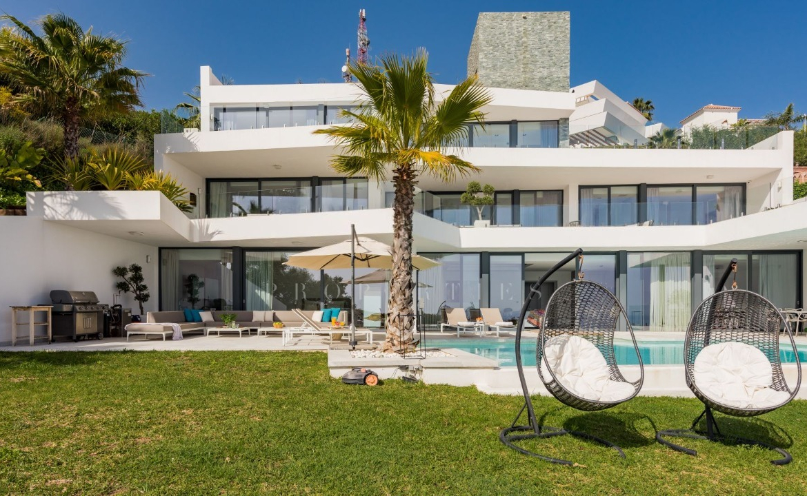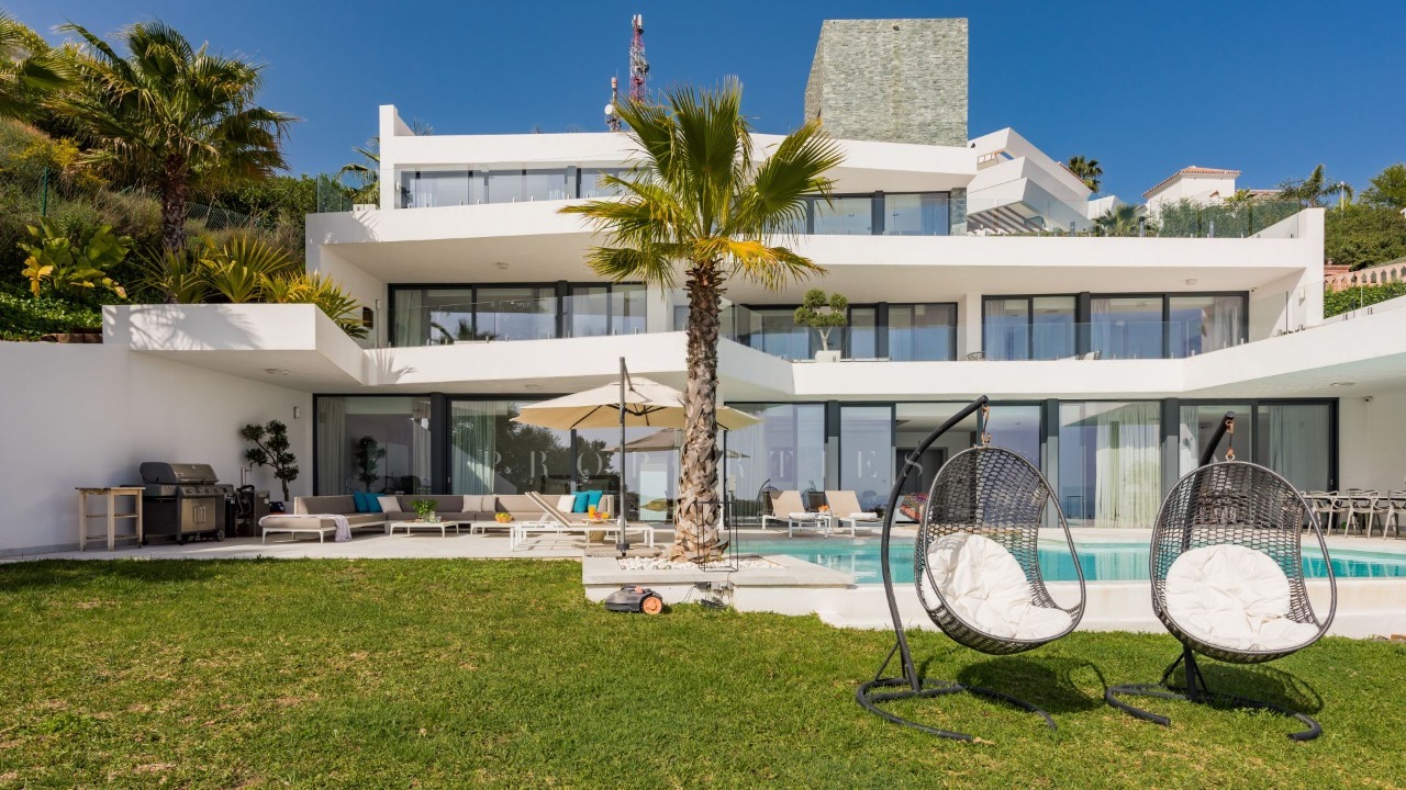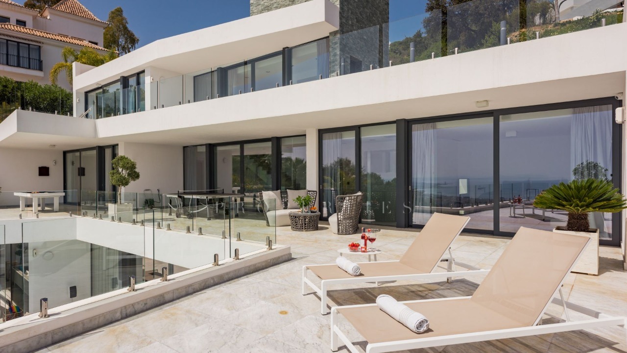 The villa boasts of two ample terraces with breathtaking views, one of them has a pool table and a ping pong table. Outdoor area comprises of a heated infinity pool, manicured garden with sun loungers, barbecue and dining patio for fourteen people to enjoy al-fresco dinner.