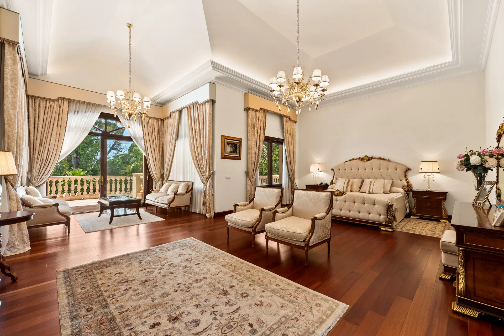 The exterior is equally impressive. A lush, expansive garden features manicured lawns, tropical plantings, and several shaded terraces perfect for al fresco dining and lounging. A large private swimming pool and ample sunbathing areas enhance the outdoor living experience. Thanks to the generous plot size and ideal orientation, the garden is bathed in natural light while maintaining a high level of privacy.