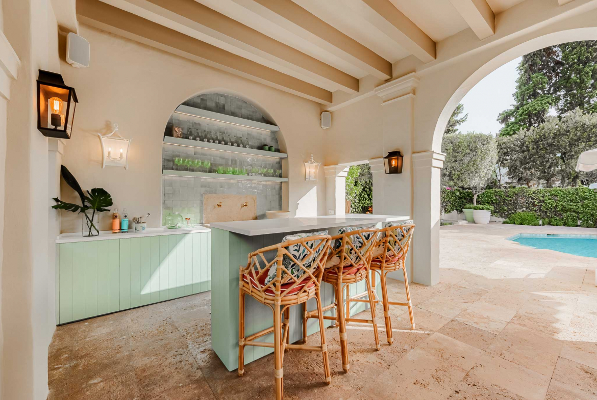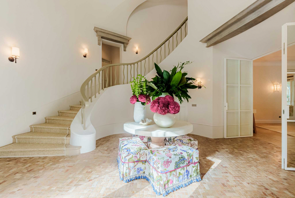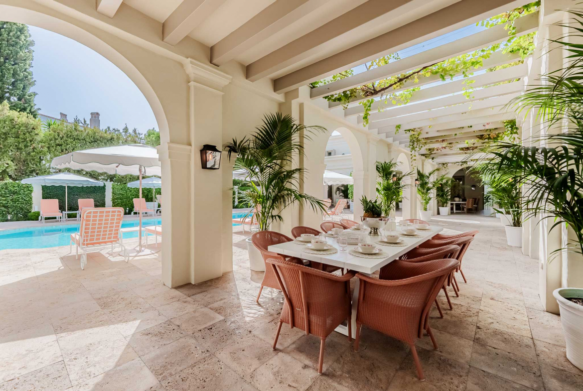 Outdoors, a stunning 78 m² swimming pool sits at the heart of the landscaped garden. Surrounded by lush greenery, the pool area enhances the villa’s atmosphere of privacy and serenity. Furthermore, shaded terraces, vine-covered pergolas, and charming archways provide multiple areas for leisure and quiet enjoyment.