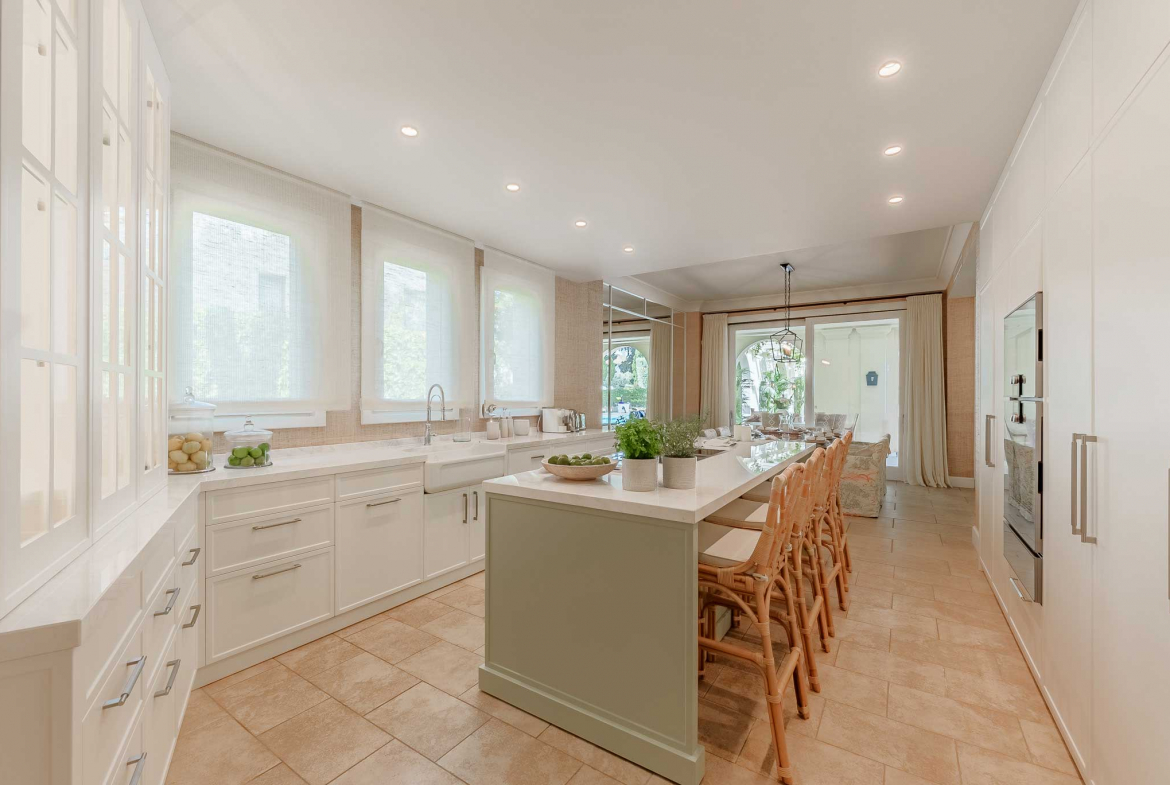 The villa includes two beautifully appointed lounge areas, a spacious kitchen, and multiple bathrooms, all designed in a cohesive French old-world style. These interiors promote relaxation and comfort while maintaining a strong sense of visual identity. As a result, the home achieves a rare balance between grandeur and intimacy.