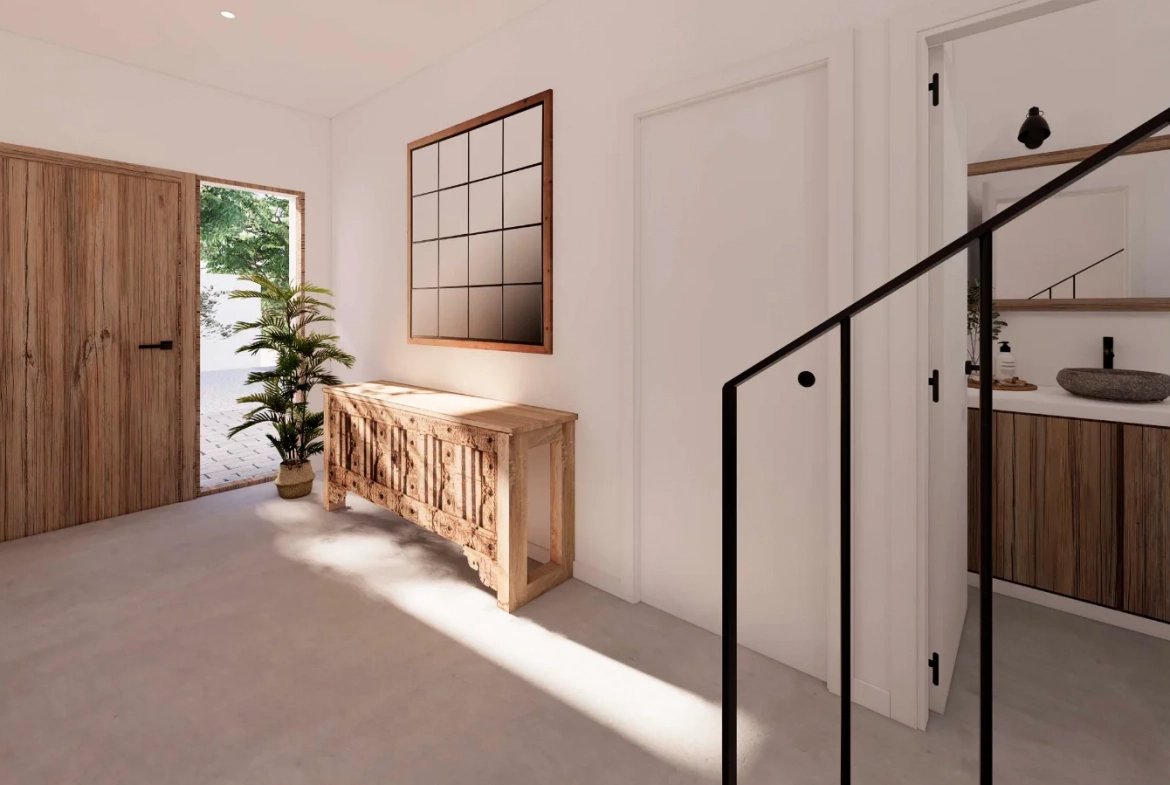 On the ground floor, the villa features an entrance hall, a guest toilet, and a storage and laundry room. In addition, this level includes a spacious dining area with an open-plan kitchen and a central cooking island.