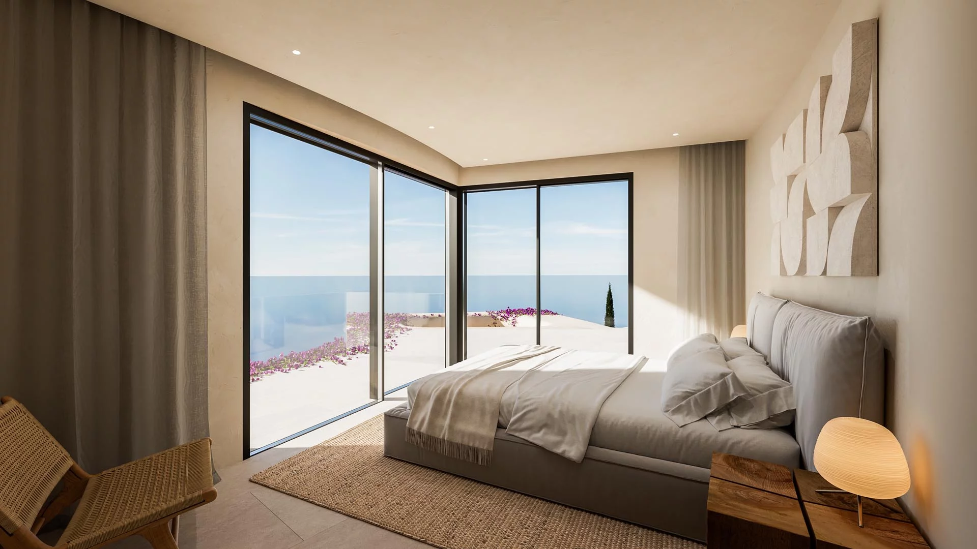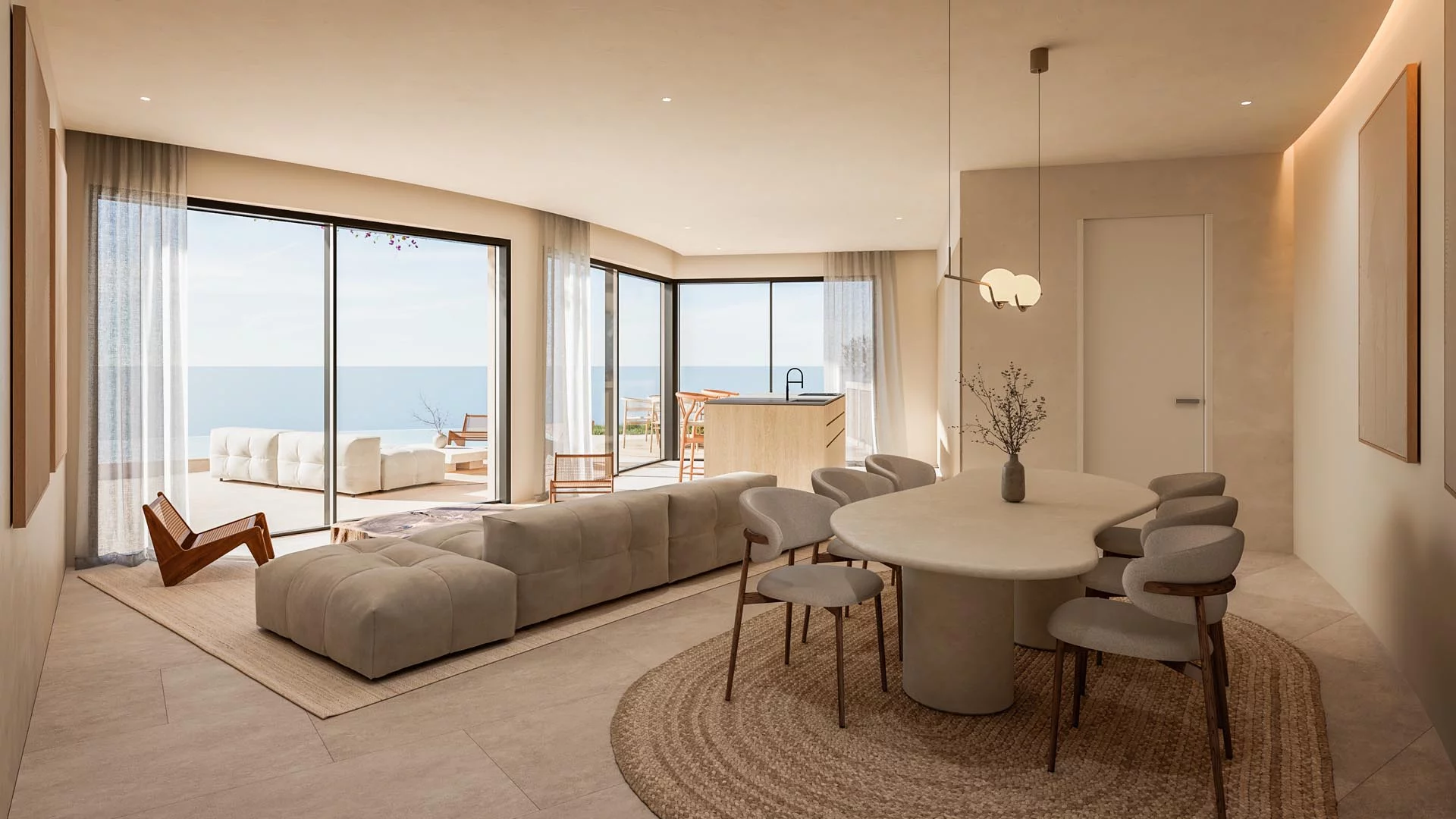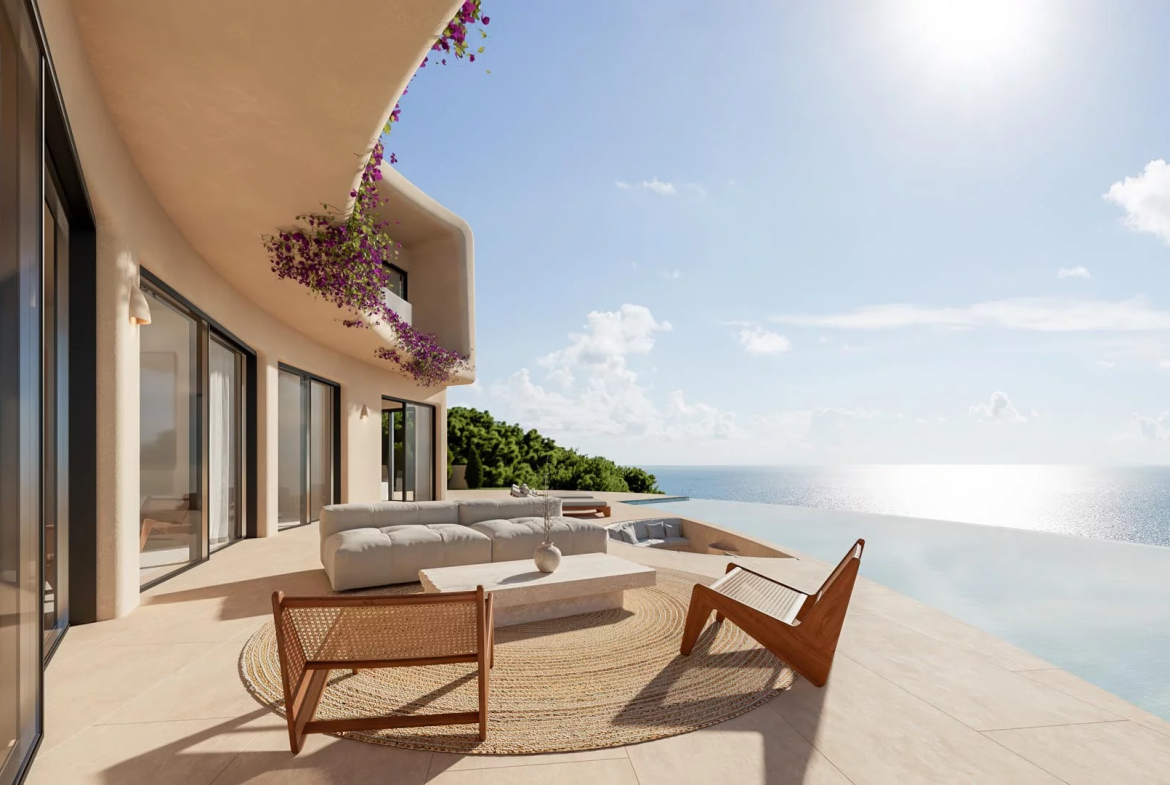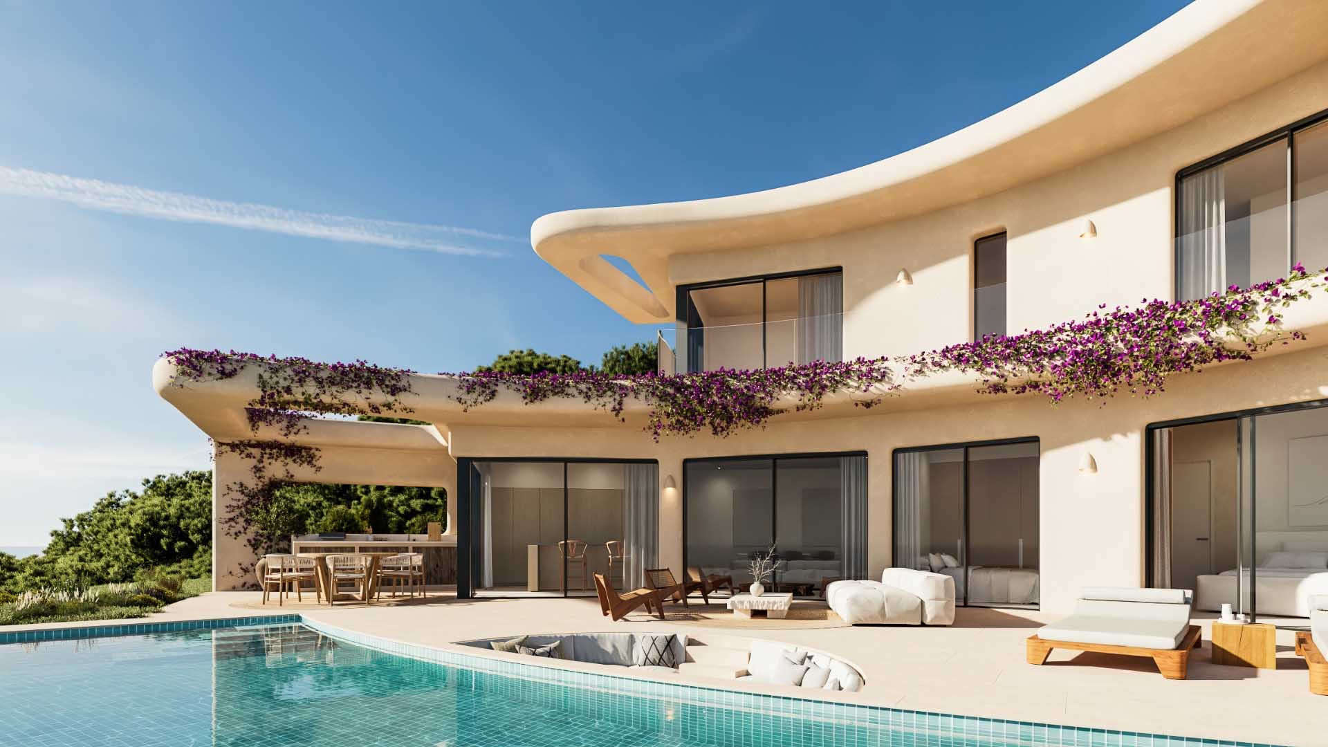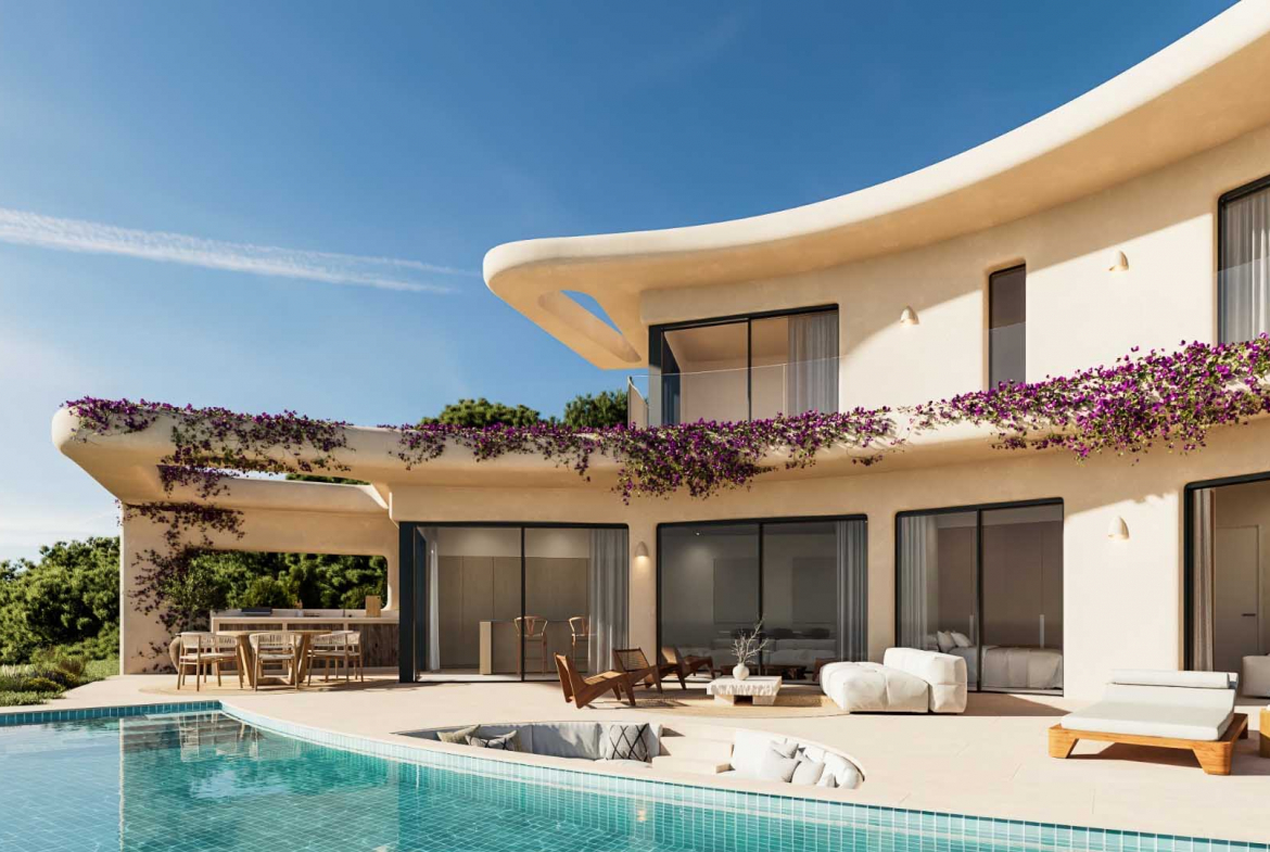 The villa features elegant Ibiza-style architecture with soft organic shapes and natural materials. Warm Mediterranean tones enhance the calm and welcoming atmosphere. As a result, the design creates a refined yet relaxed lifestyle where comfort and style come together.