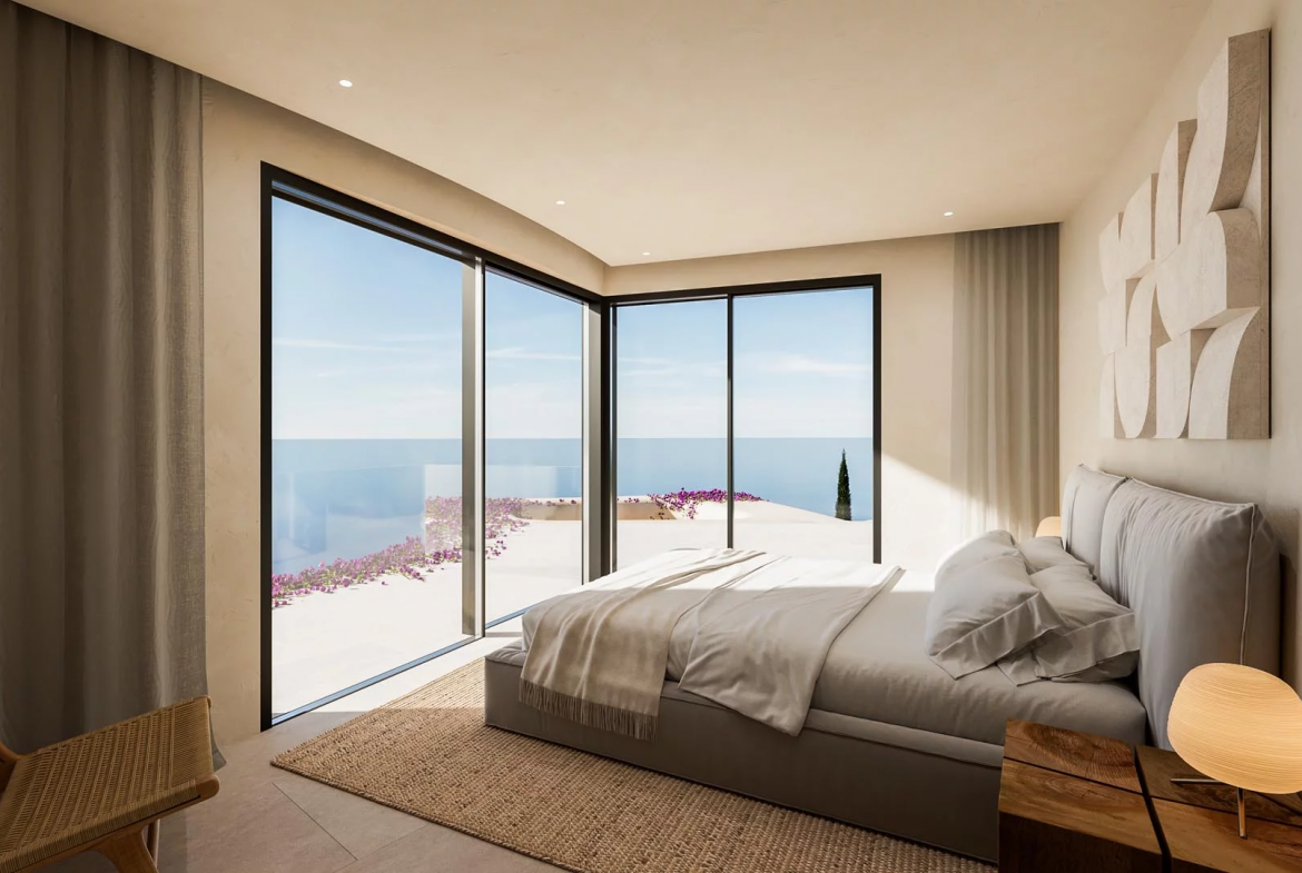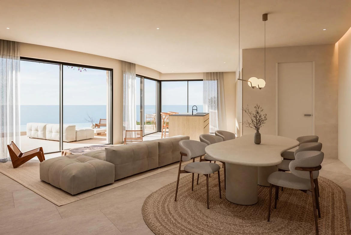 The layout connects indoor and outdoor spaces naturally and harmoniously. Spacious living areas open directly onto large terraces through wide glass openings. Consequently, the home allows you to enjoy the coastal scenery from almost every corner.