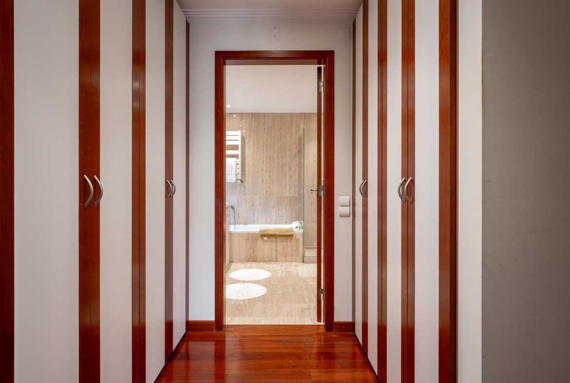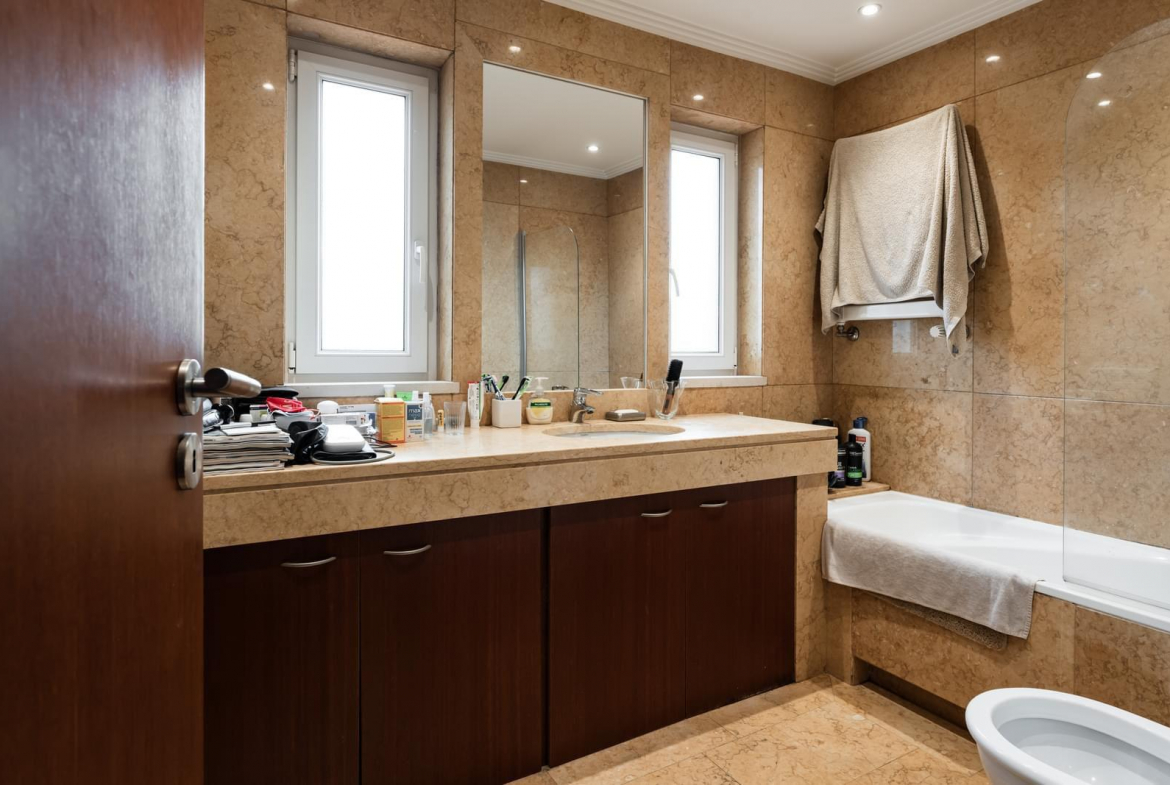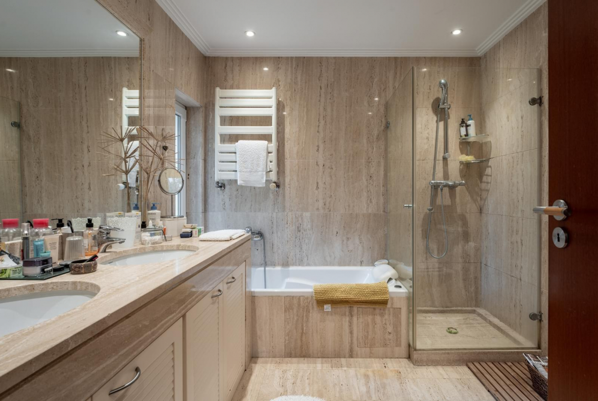 The home includes five spacious suites, each designed as a private retreat. In addition, the property offers eight designer bathrooms. The master bathroom stands out with floor-to-ceiling book-matched marble finishes.