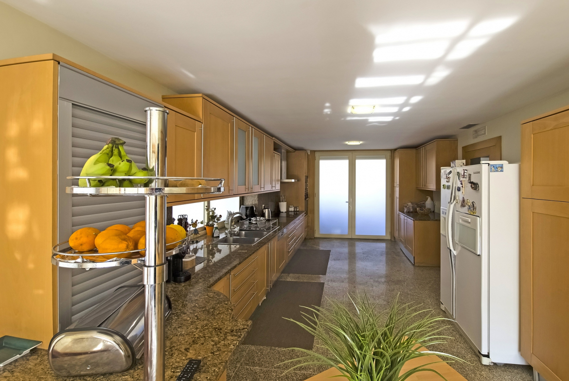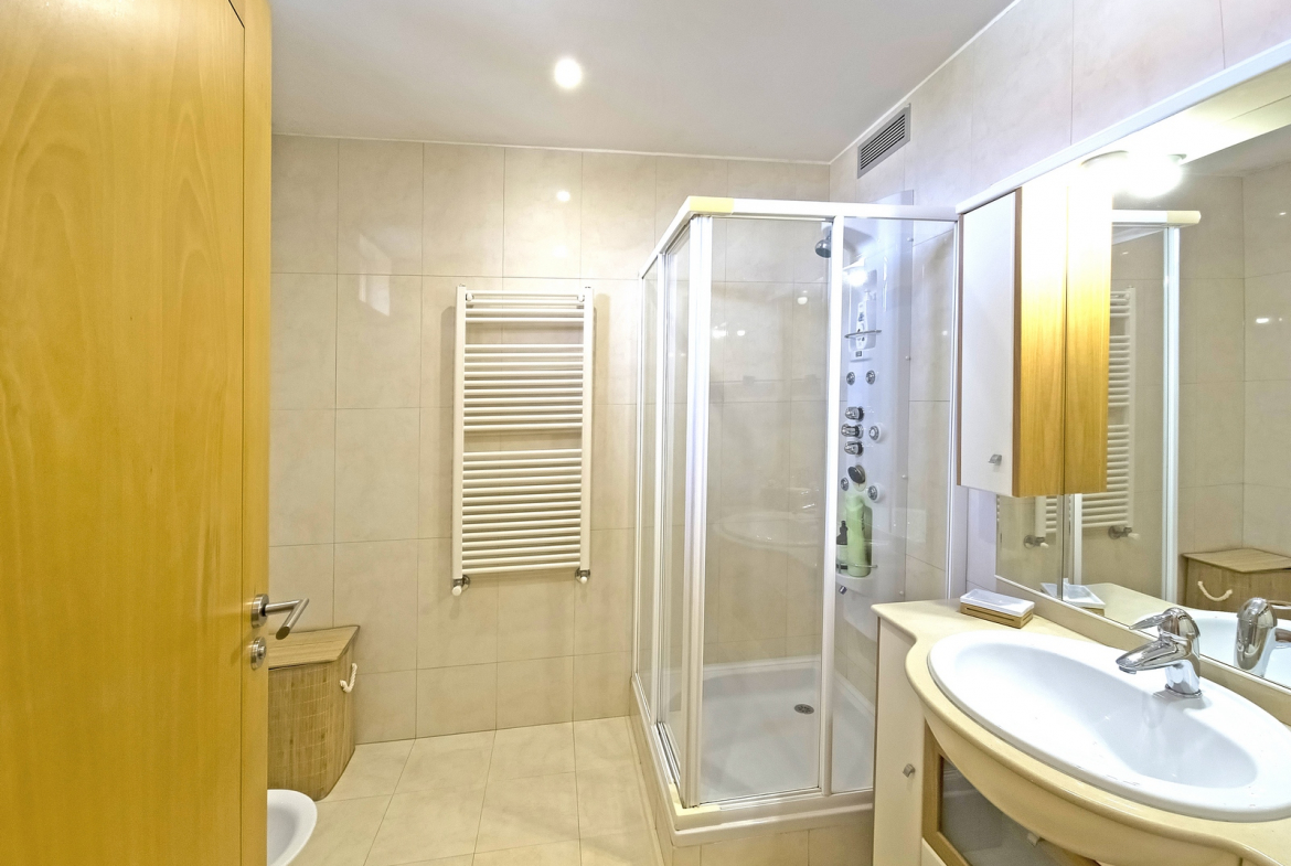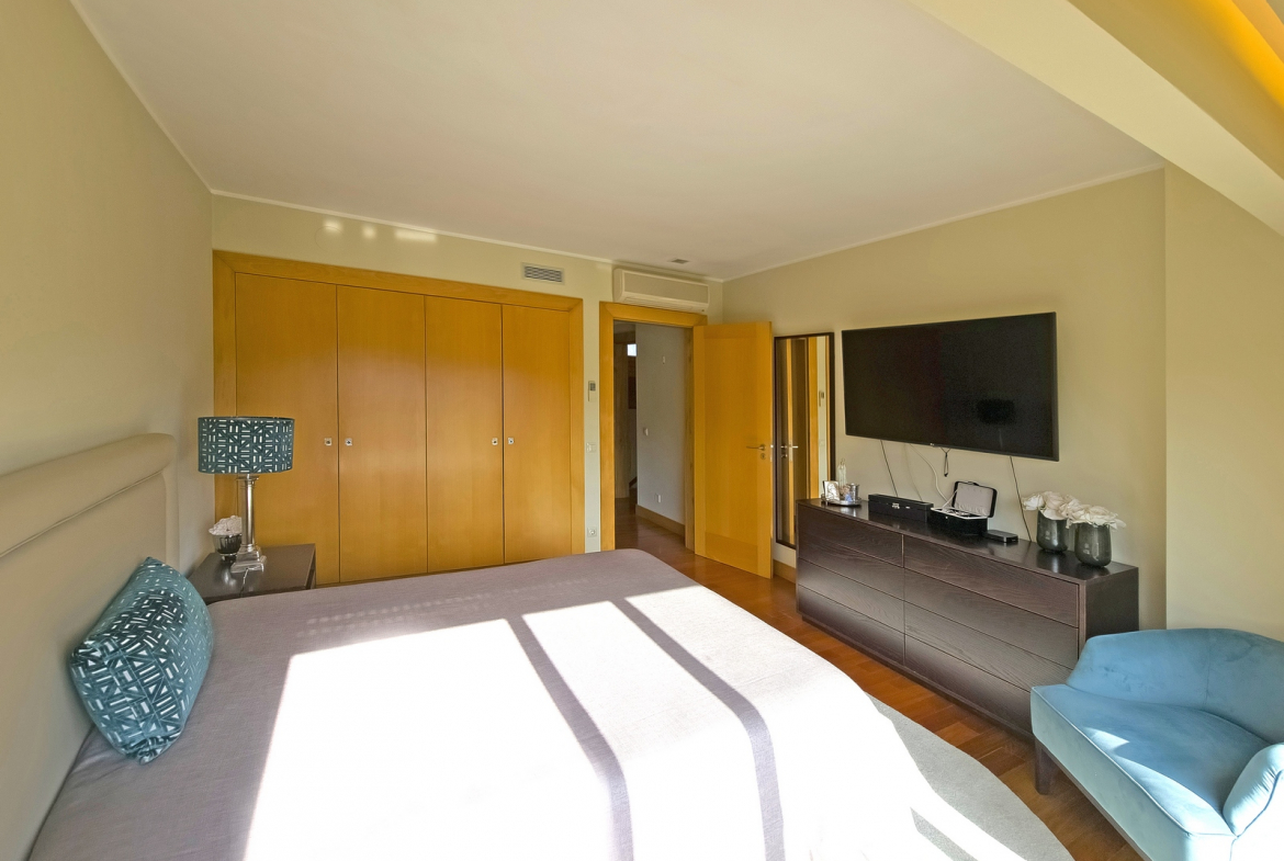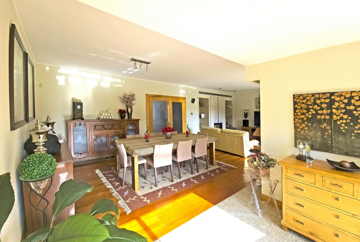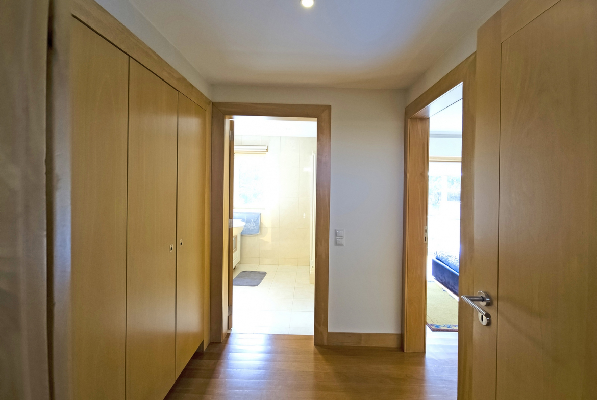 The villa also includes a closed private garage, providing secure parking and storage. Outside, a beautifully maintained surrounding garden enhances the home’s sense of tranquility and privacy. In addition, the outdoor space introduces a natural element that perfectly complements the interior comfort.