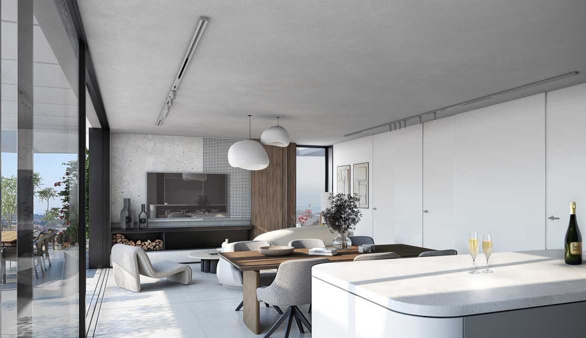 The penthouses feature spacious solariums and private pools, offering elevated outdoor spaces with beautiful panoramic views.