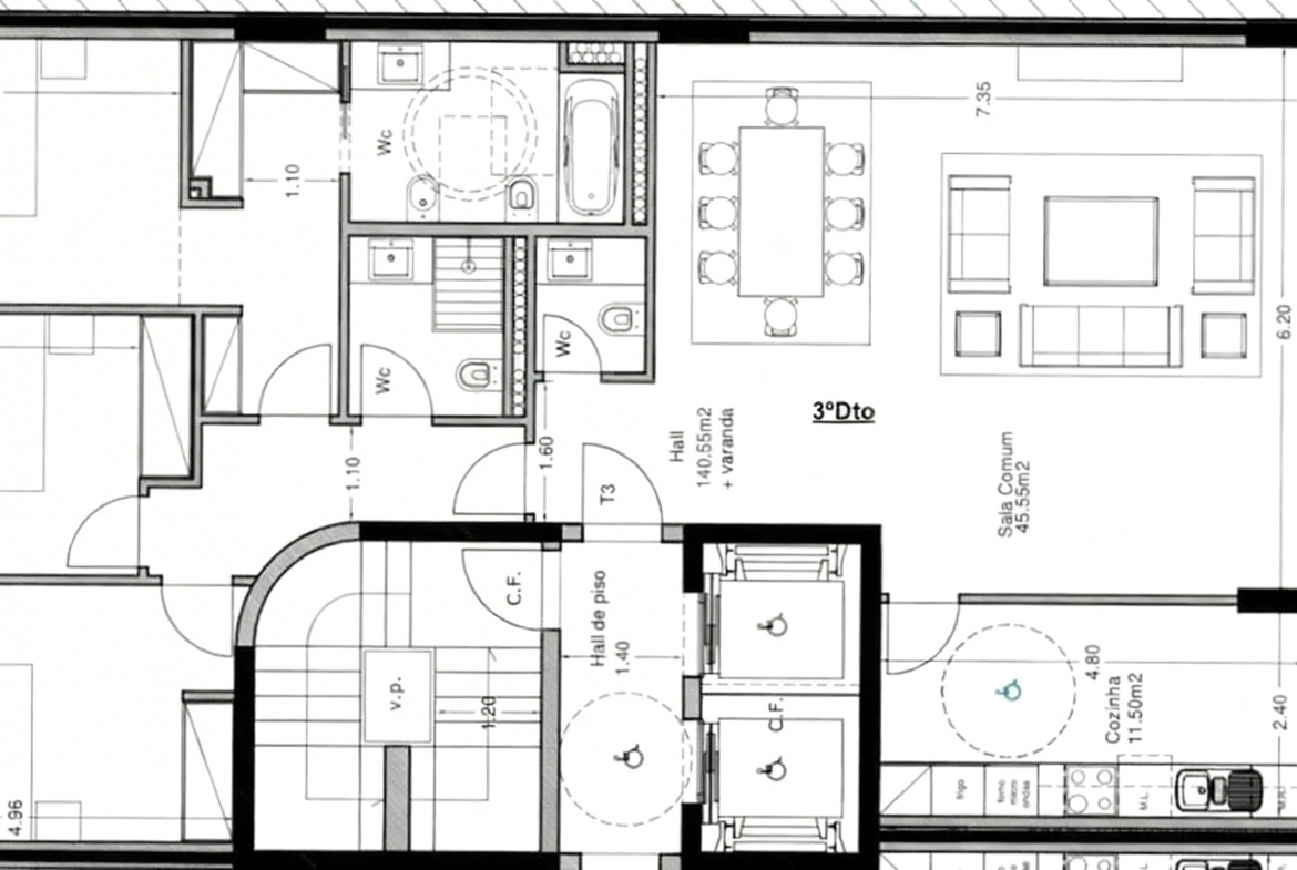 The fully equipped kitchen connects seamlessly to the social area. In addition, both the living and service areas have direct access to a generous 19.90 m² balcony. Consequently, it provides an ideal space for relaxing or entertaining.