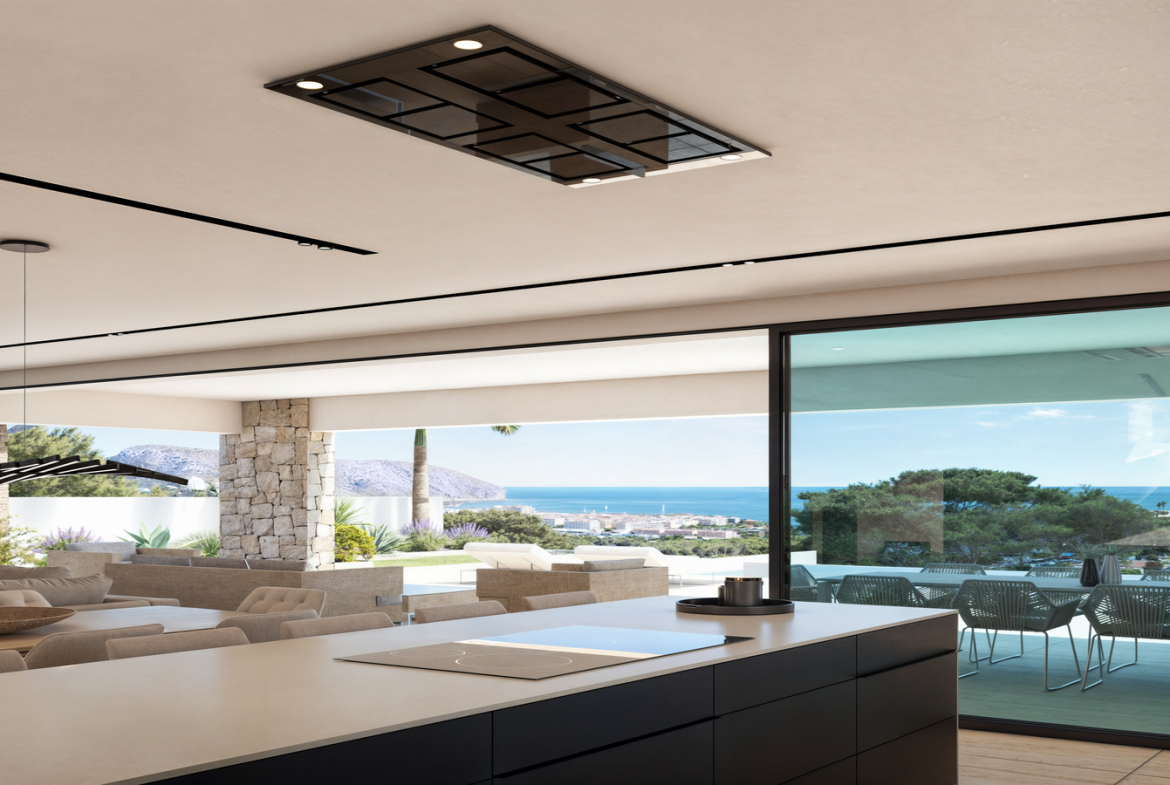 The ground floor offers a bright, open-plan living and dining area. This space connects directly to a modern kitchen with a central island. In addition, large sliding doors open onto the terrace, summer kitchen, and private swimming pool.